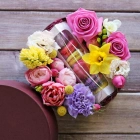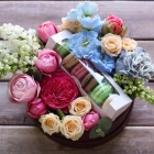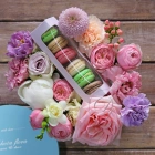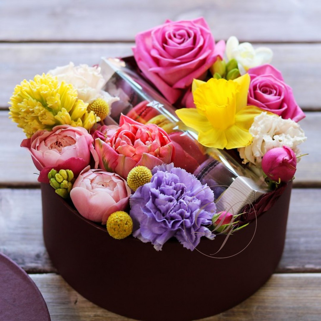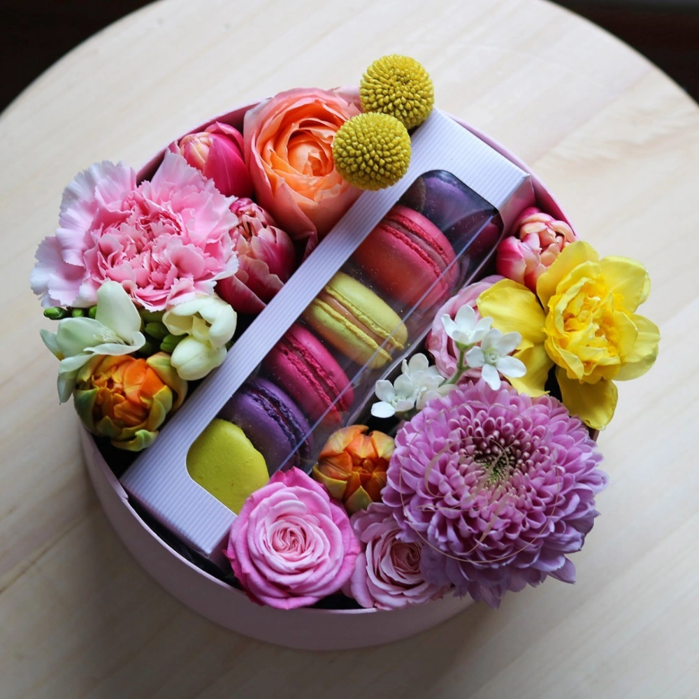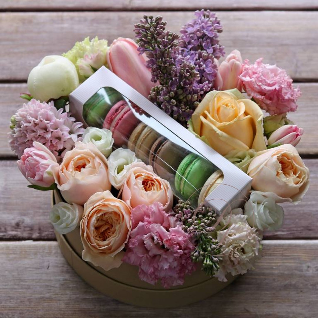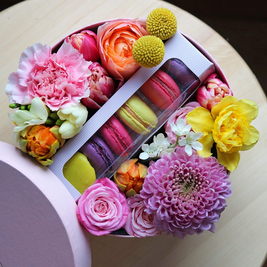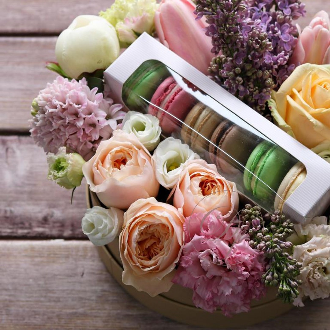 Авторские цветочные композиции в элегантных коробках различных форм, цветов, размеров, с добавлением сладостей в виде: баночки меда peroni, французских пирожных macarons, имбирных пряников и свежих ягод.