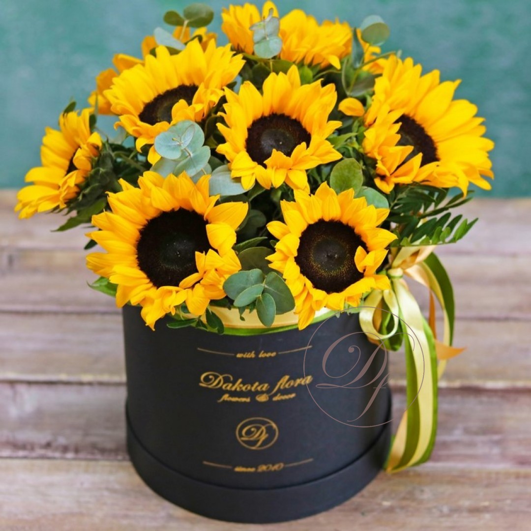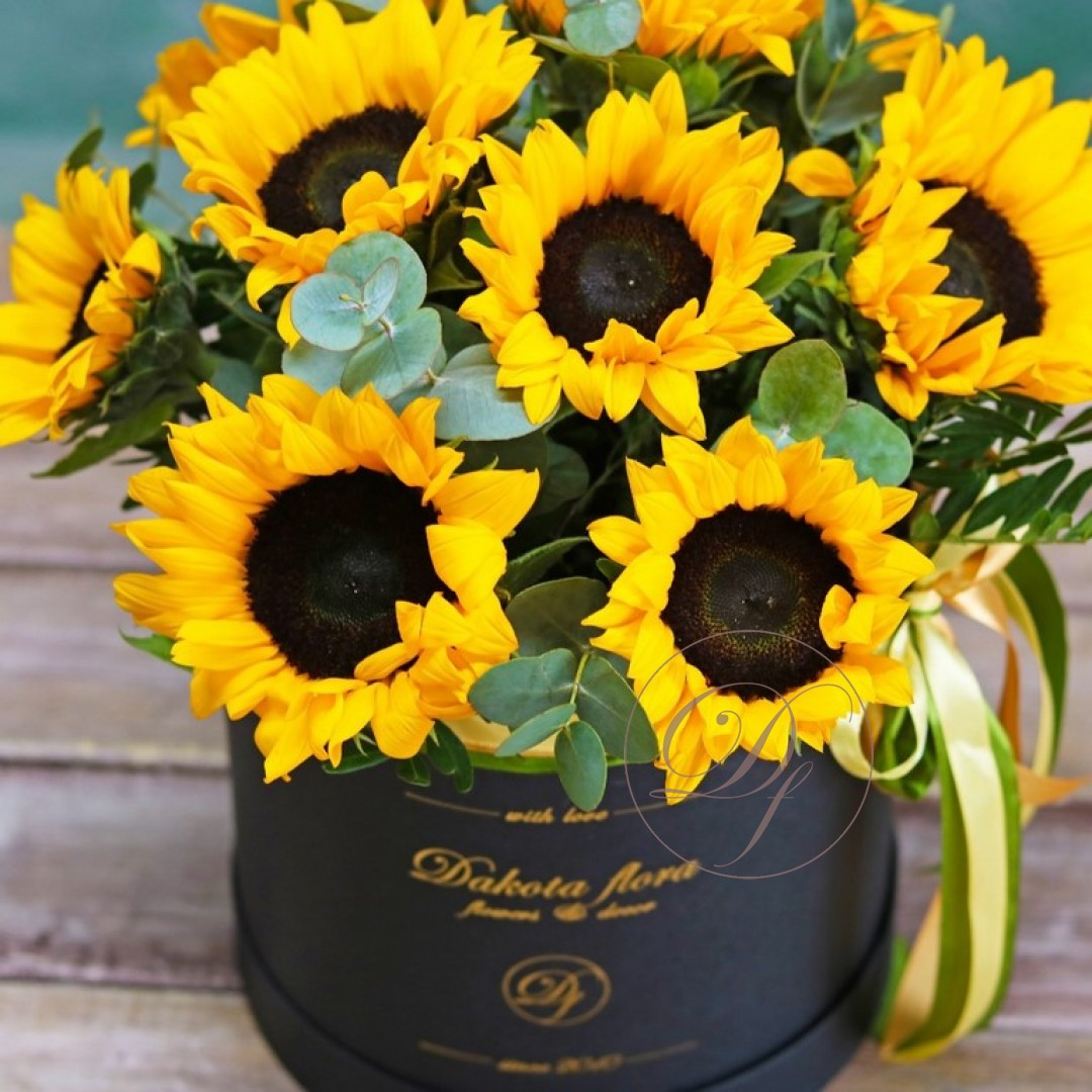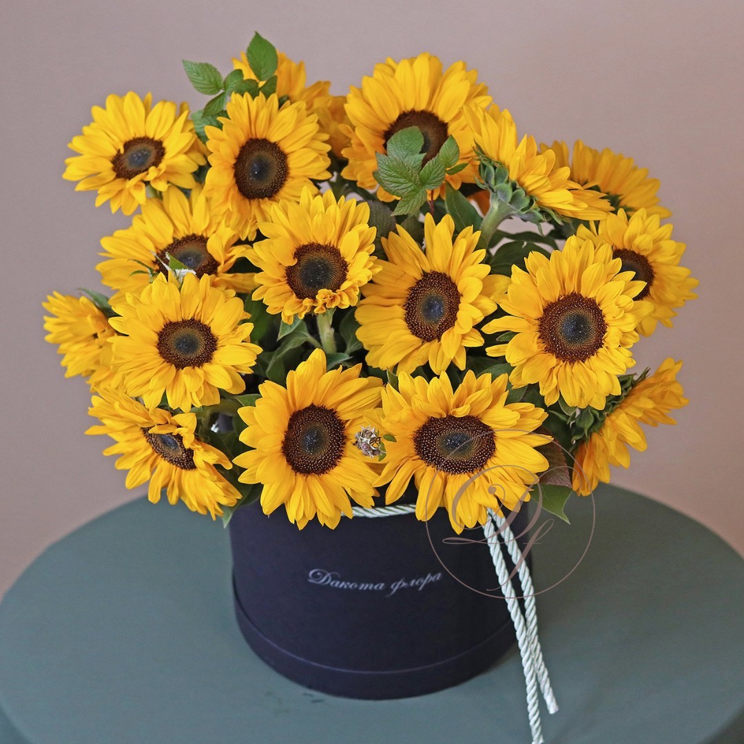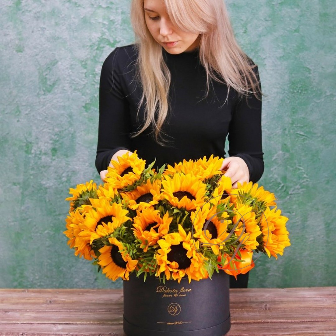 Купить подсолнухи в Москве. Цветы в коробке это композиции, составленные с использованием специальной губки Oasis (пиафлор) которая пропитана водой. Для того чтобы цветы дольше оставались свежими, добавляйте в нее немного воды каждый день.