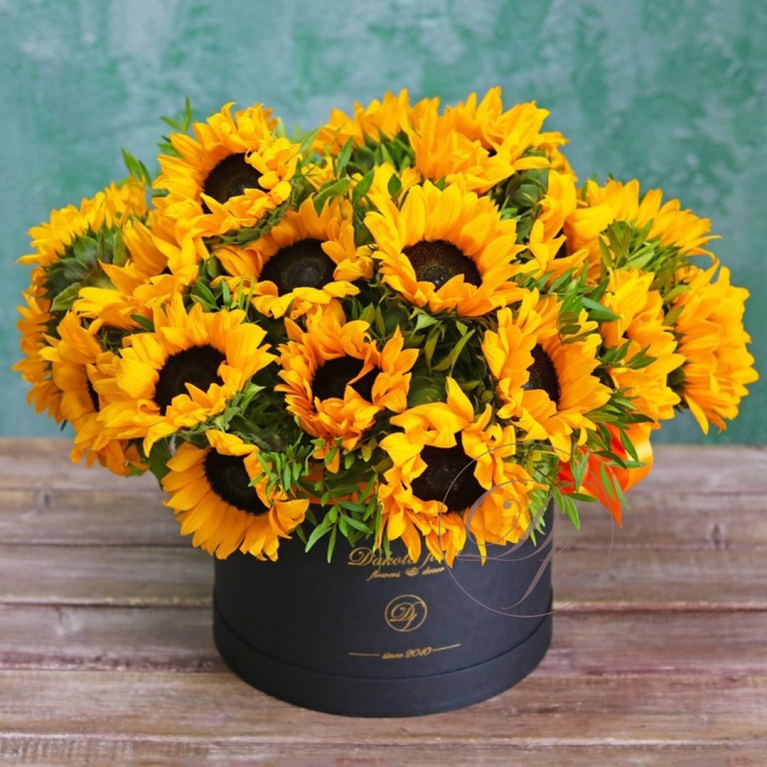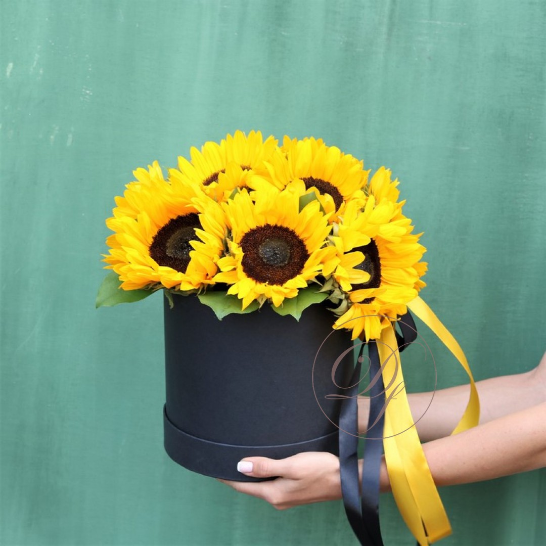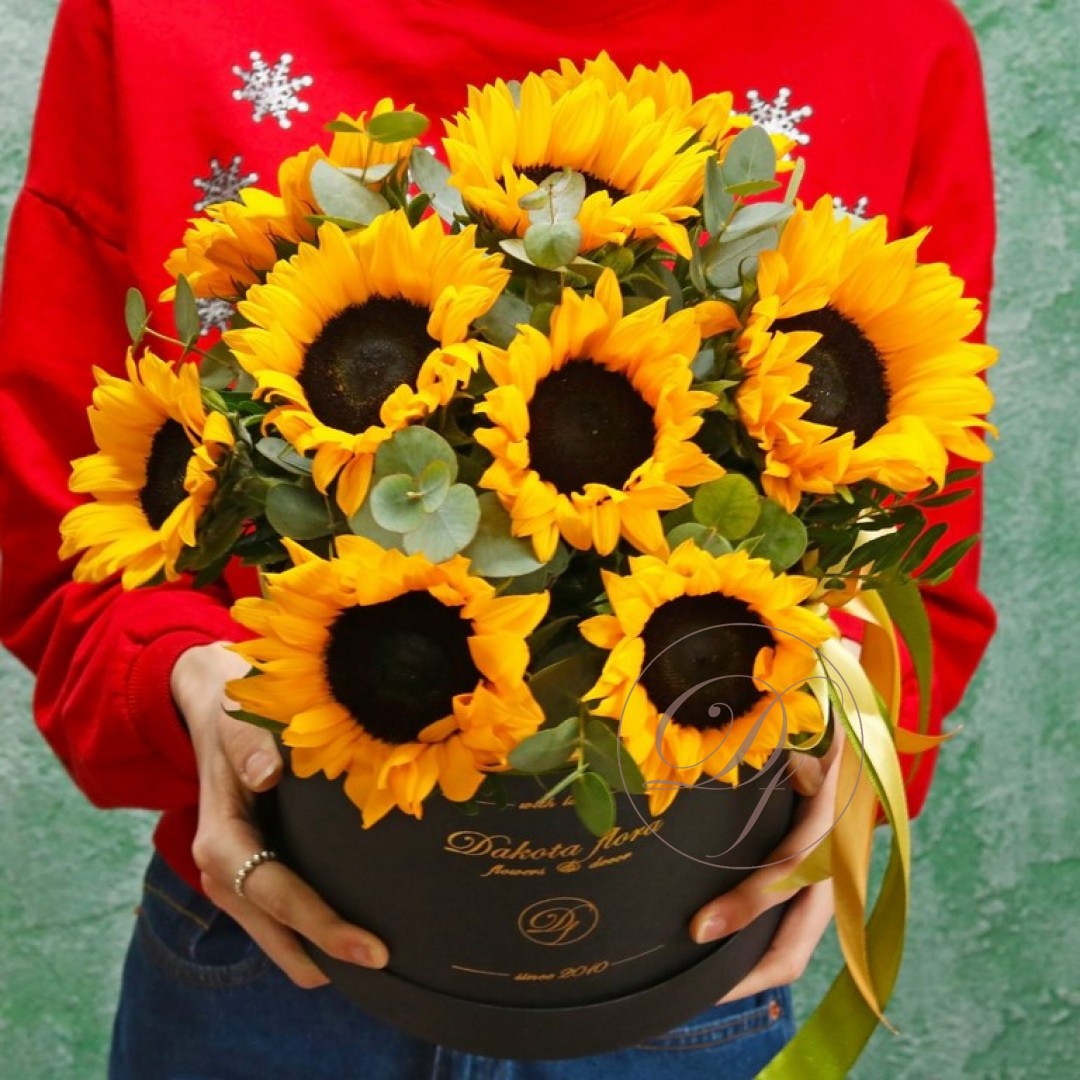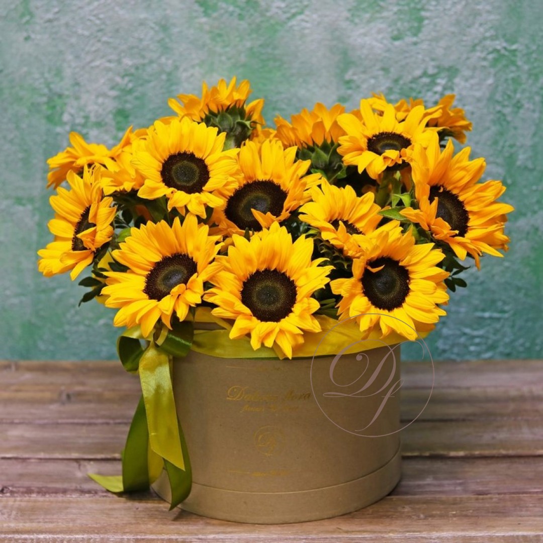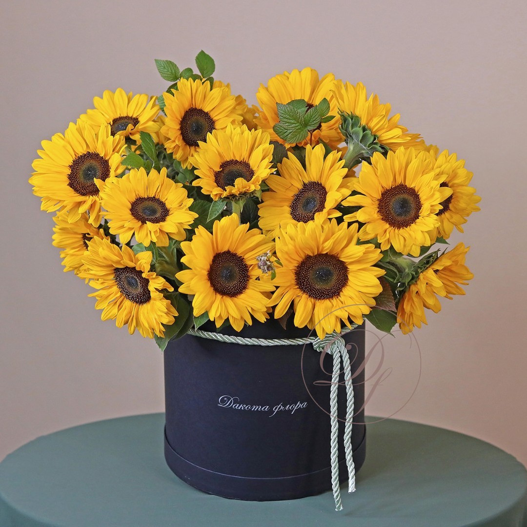 Купить подсолнухи в Москве. Цветы в коробке это композиции, составленные с использованием специальной губки Oasis (пиафлор) которая пропитана водой. Для того чтобы цветы дольше оставались свежими, добавляйте в нее немного воды каждый день.