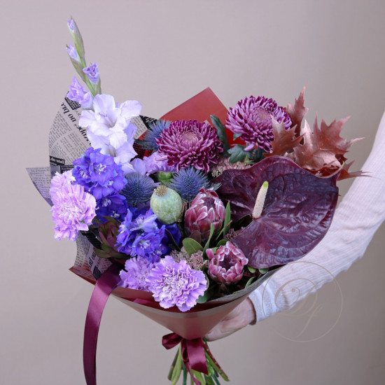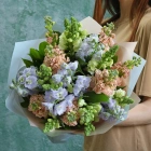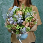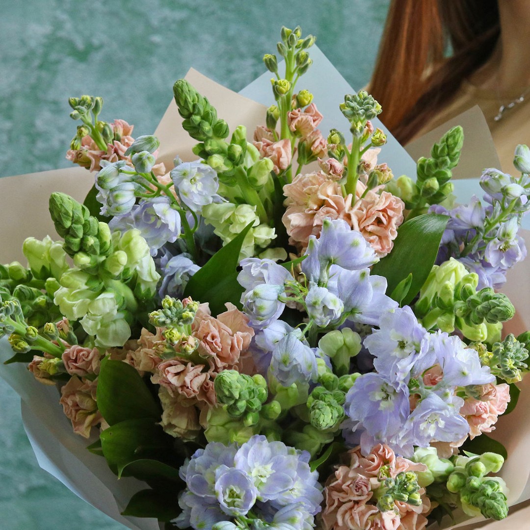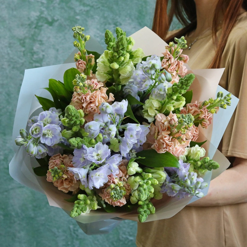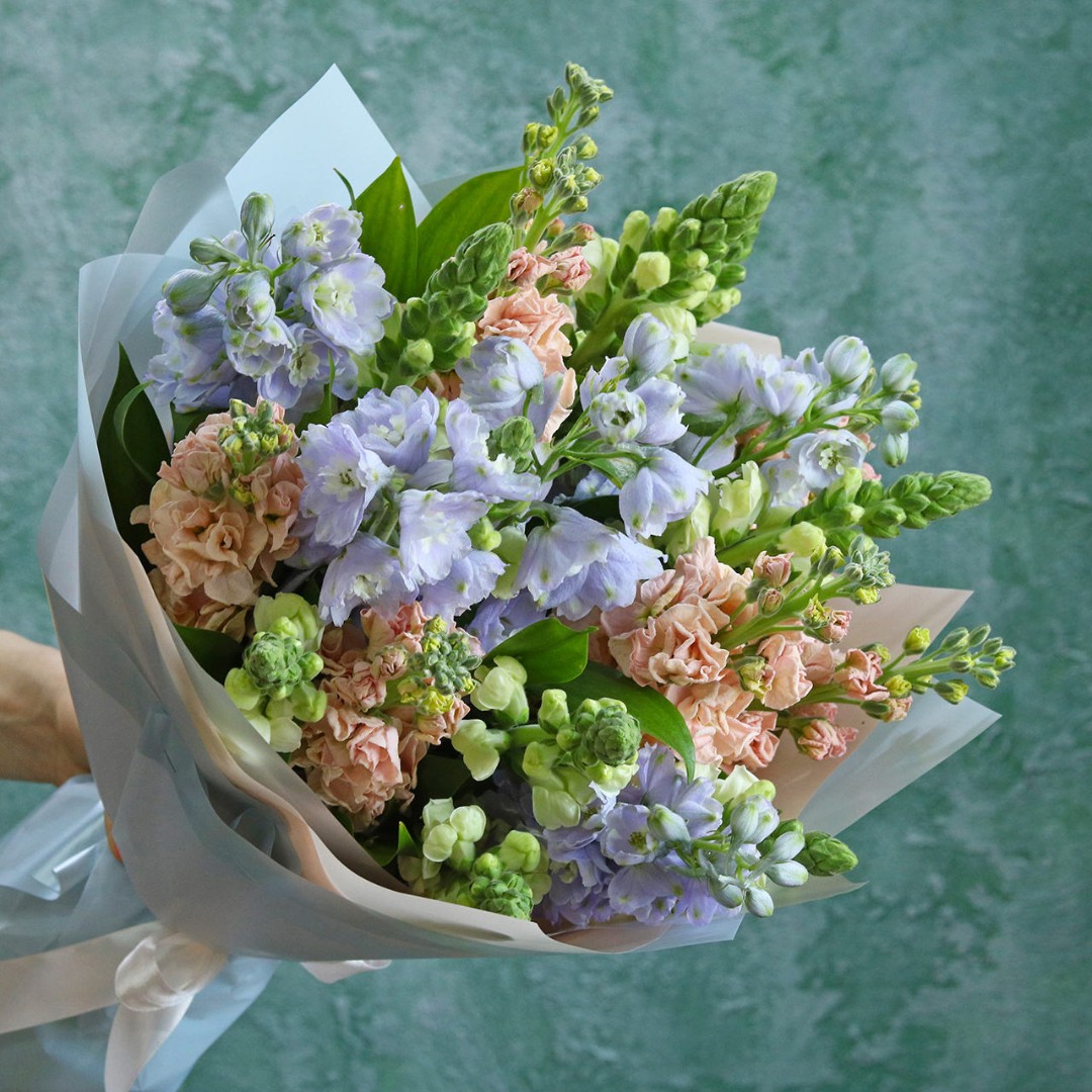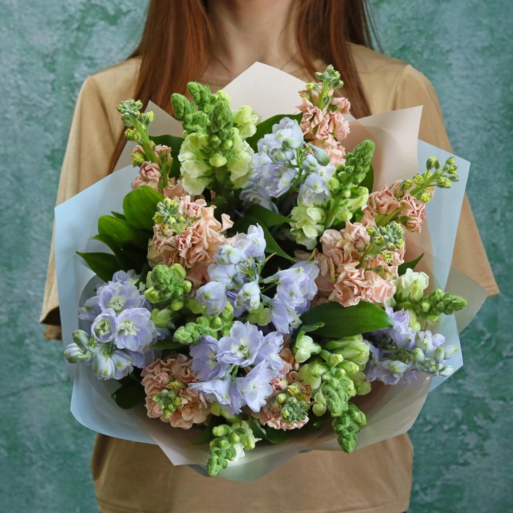 Полевой букет из маттиолы, антиринума и дельфиниума. Вы можете выбрать любой размер из указанных в перечне к данному букету.