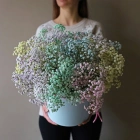 Разноцветная гипсофила в коробке. На фотографии 25 гипсофил в коробке. Цветы в коробках это композиции, составленные с использованием специальной губки Oasis (пиафлор) которая пропитана водой. Для того чтобы цветы дольше оставались свежими, добавляйте в нее немного воды каждый день.