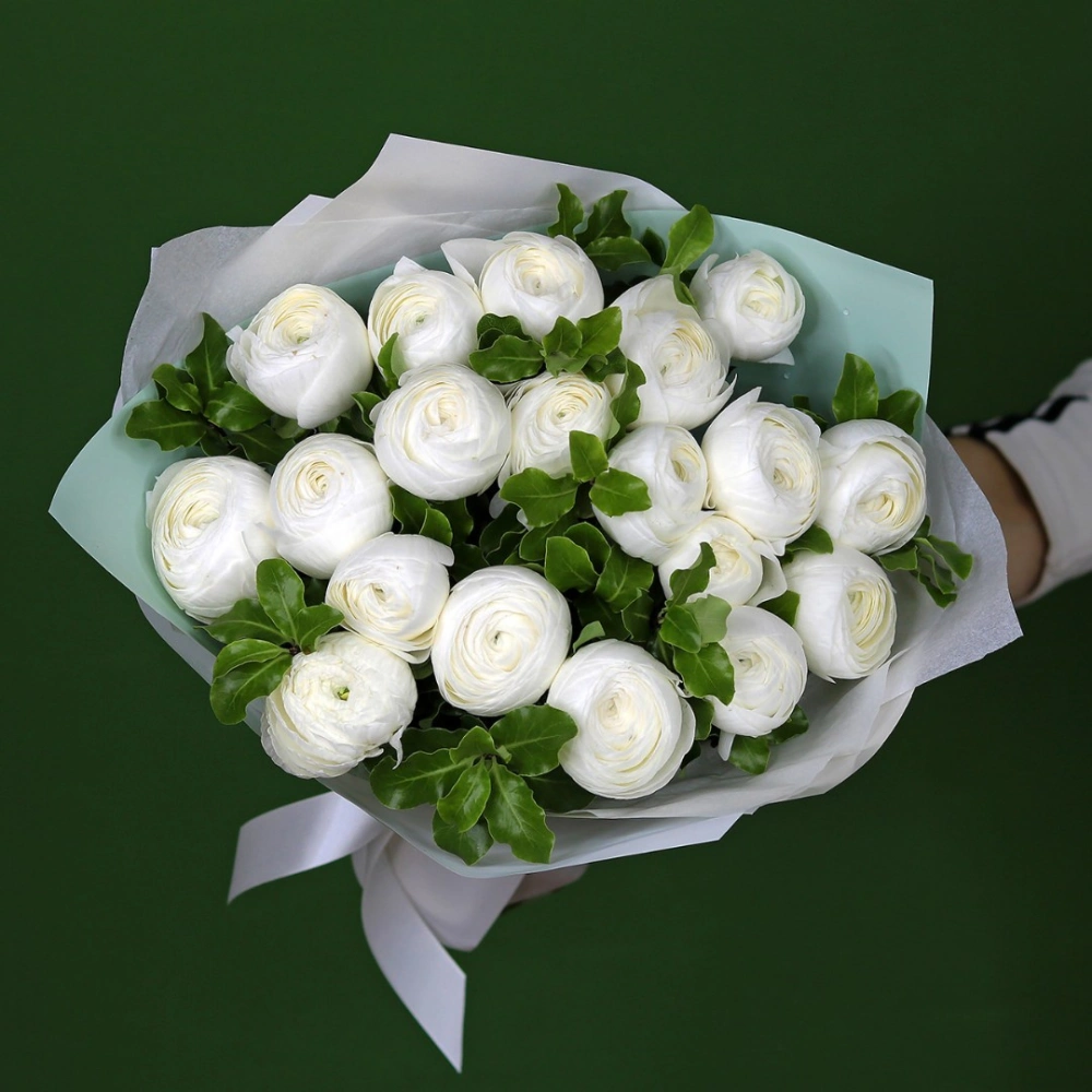 Букет ранункулюсов ханой. На фотографии 19 ранункулюсов в букете. Белые ранункулюсы ханой в букете. Вы можете выбрать любое количество цветов указанное в перечне к данному букету.