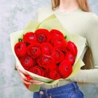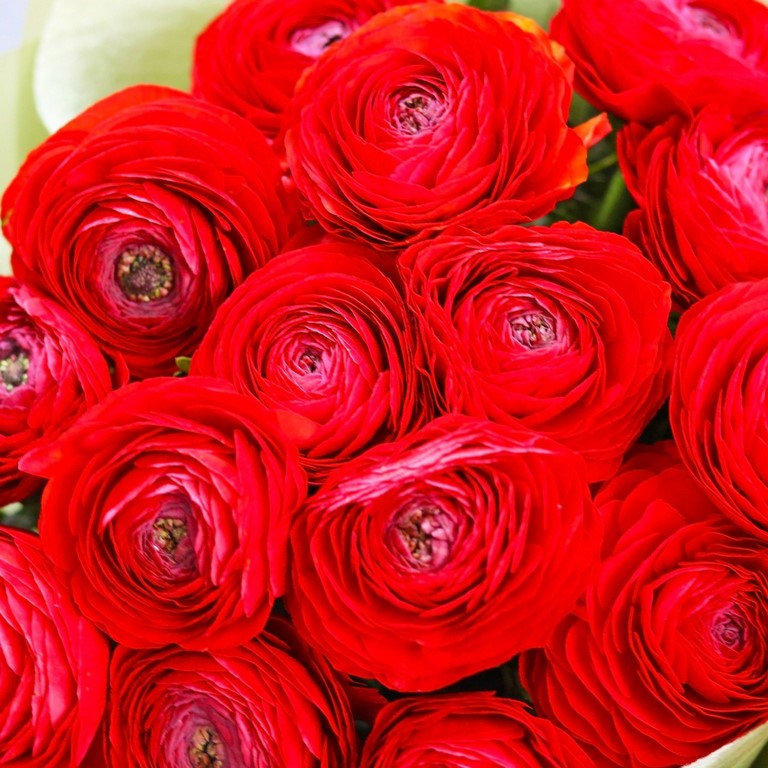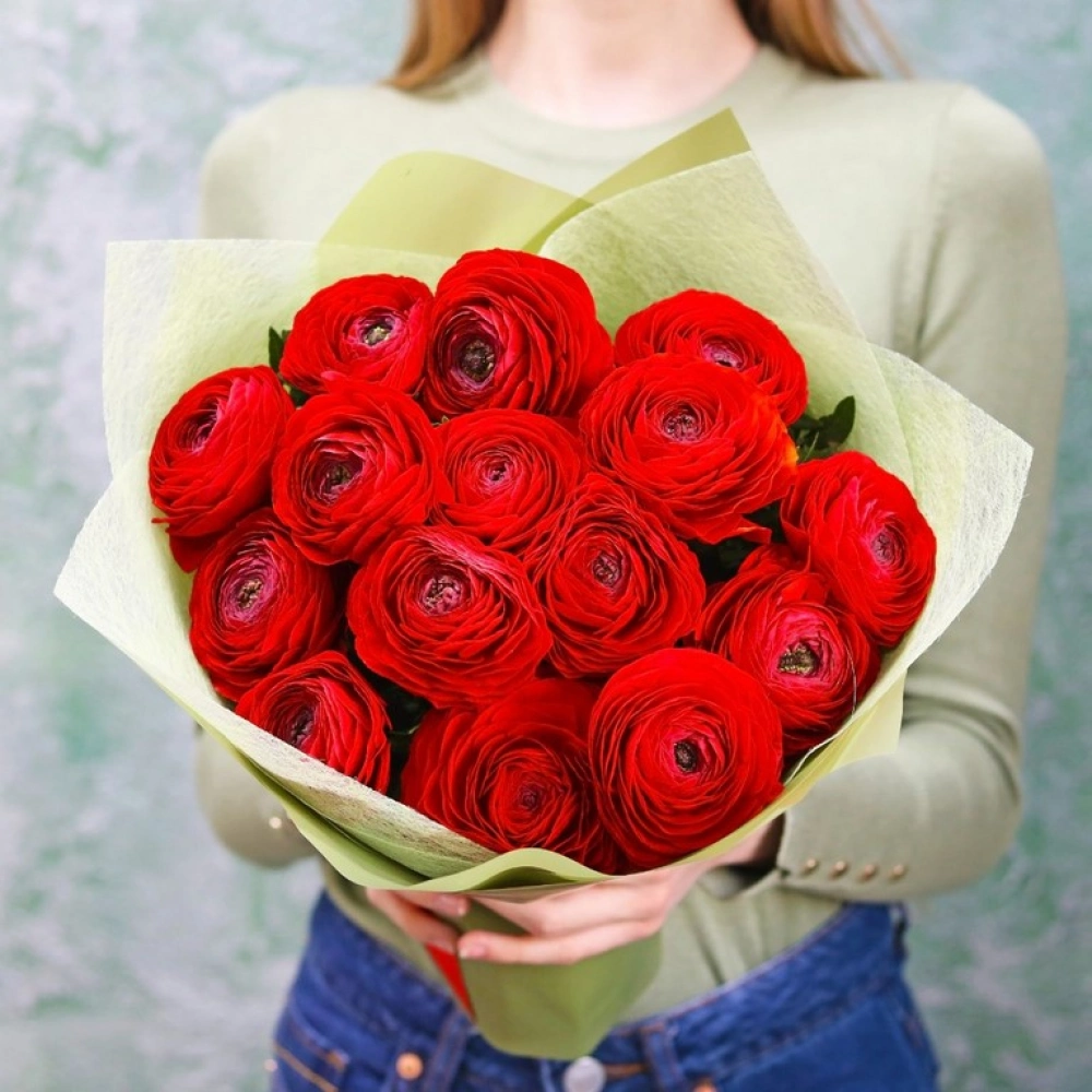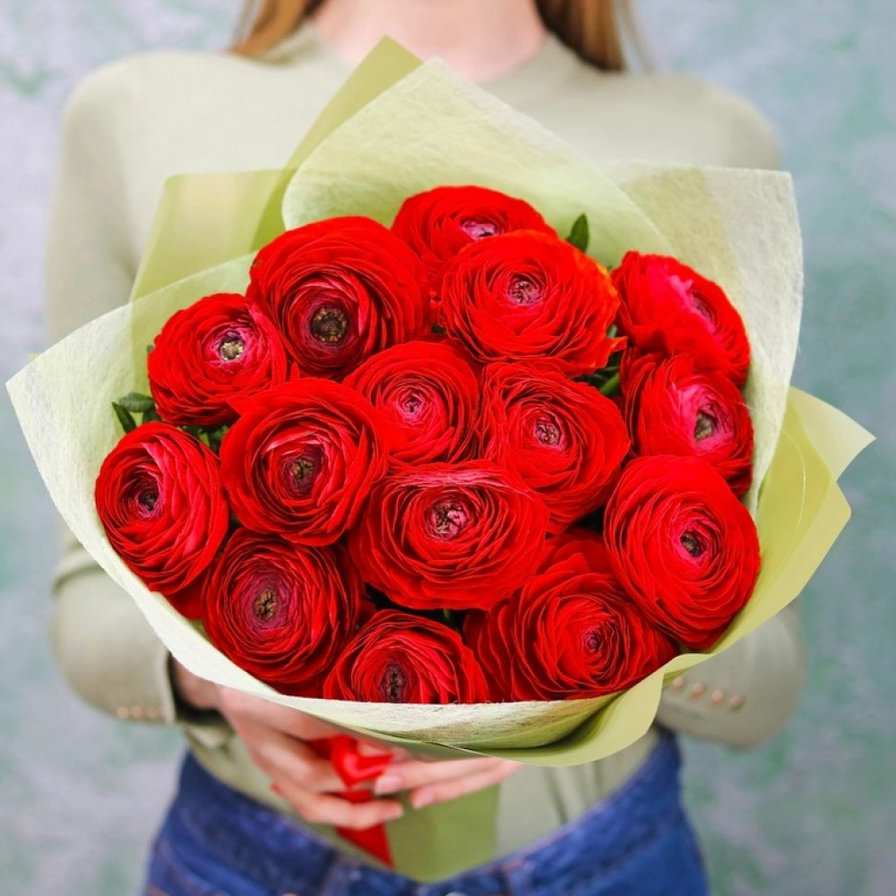 Букет красных ранункулюсов. На фотографии 15 ранункулюсов в букете. Вы можете выбрать любое количество цветов указанное в перечне к данному букету.