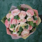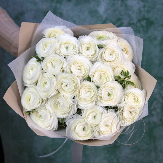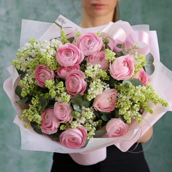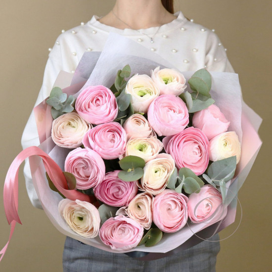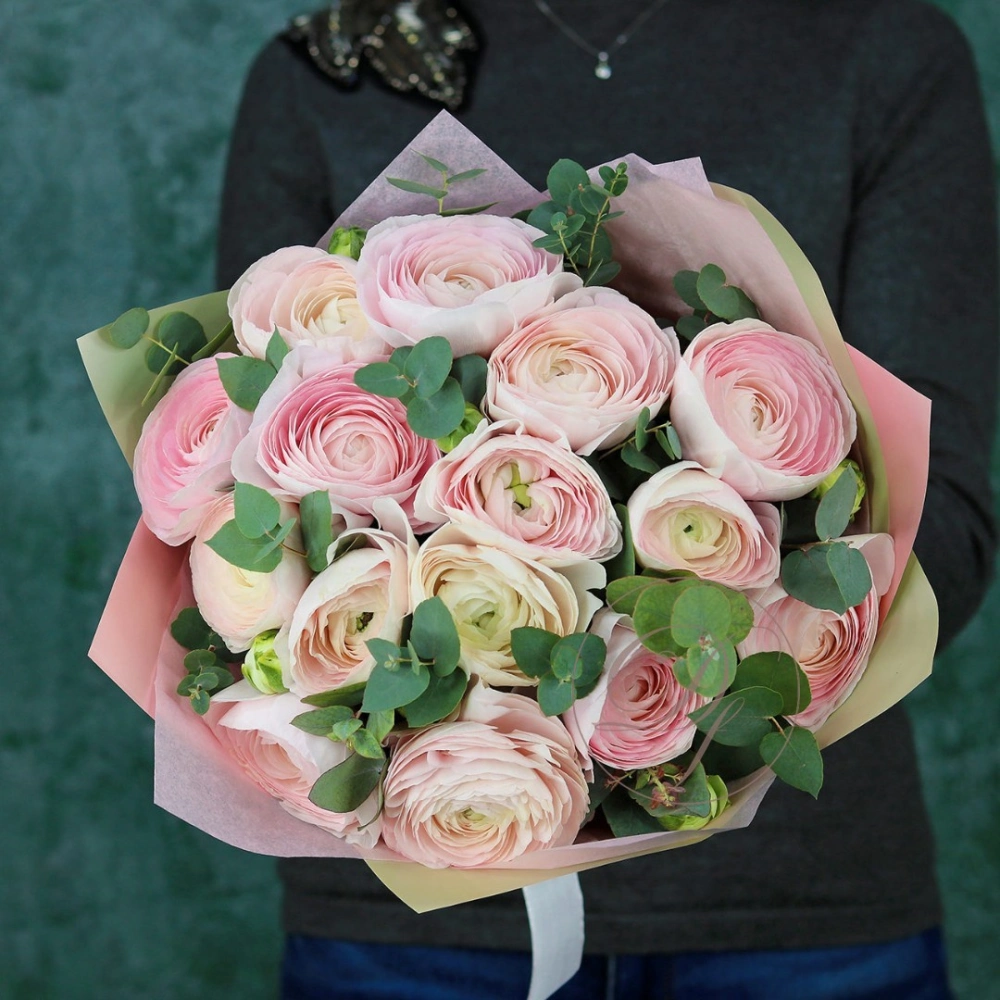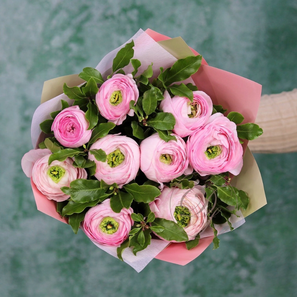 Букет ранункулюсов ханой. На фотографии 9 ранункулюсов в букете. Нежно-розовые ранункулюсы ханой в букете. Вы можете выбрать любое количество цветов указанное в перечне к данному букету.
