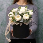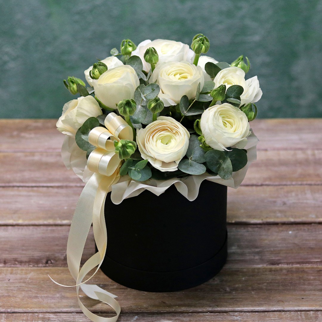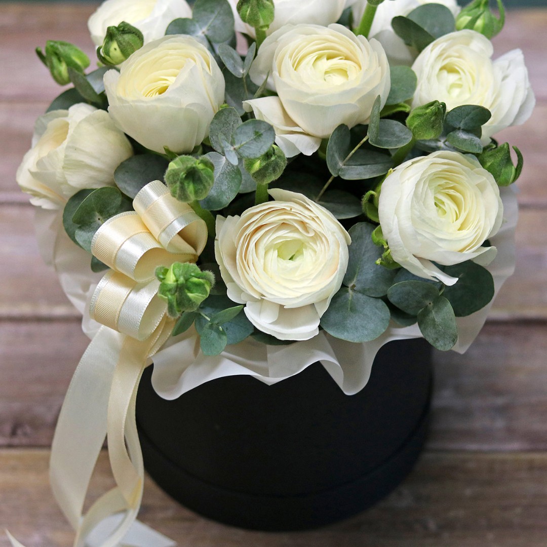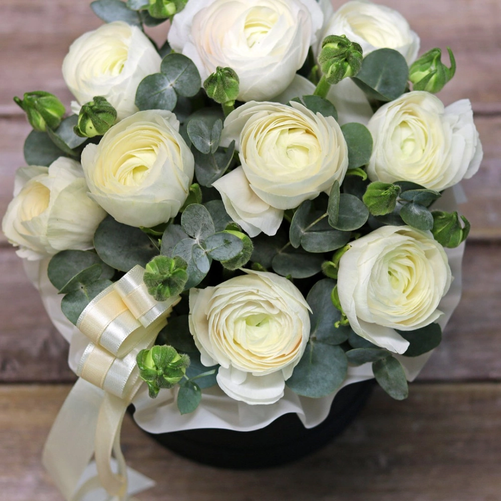 Белые Ранункулюсы с эвкалиптом в коробочке. На фотографии 9 ранункулюсов. Вы можете выбрать любое количество цветов указанное в перечне к данному букету.