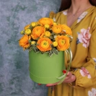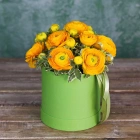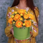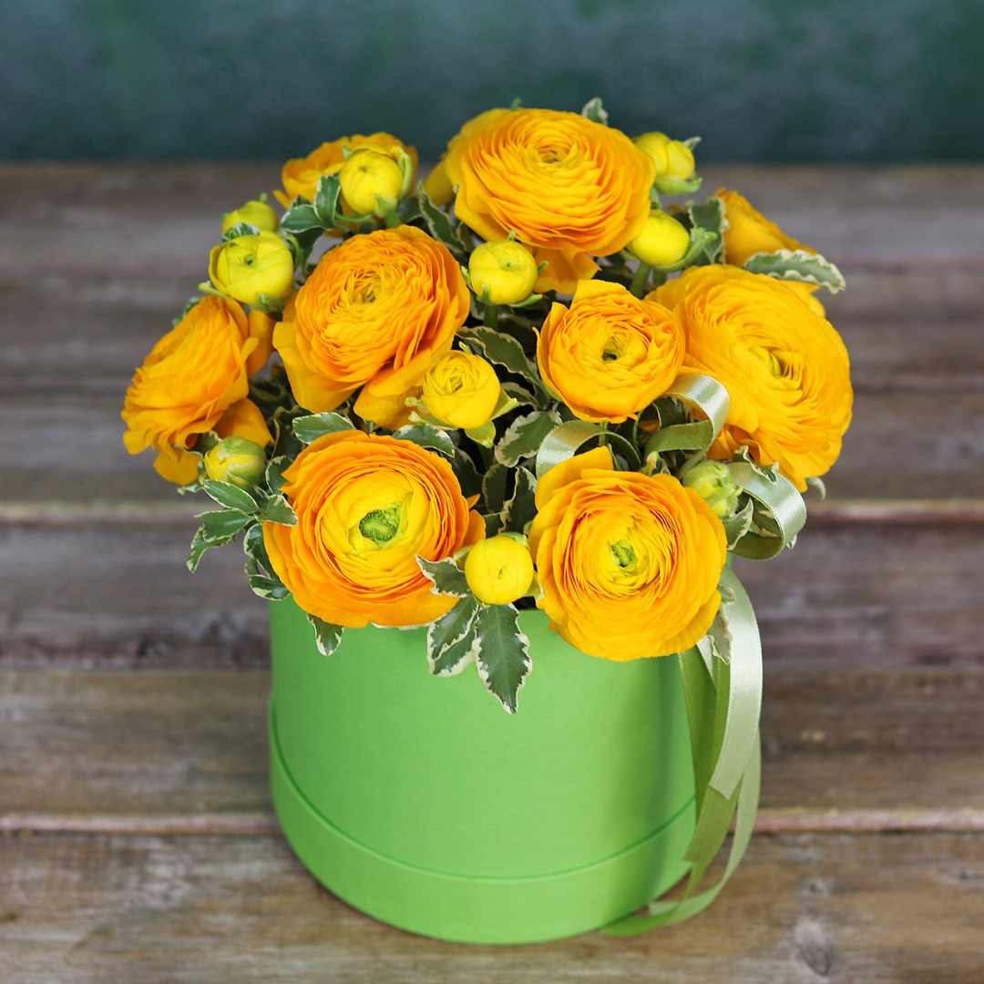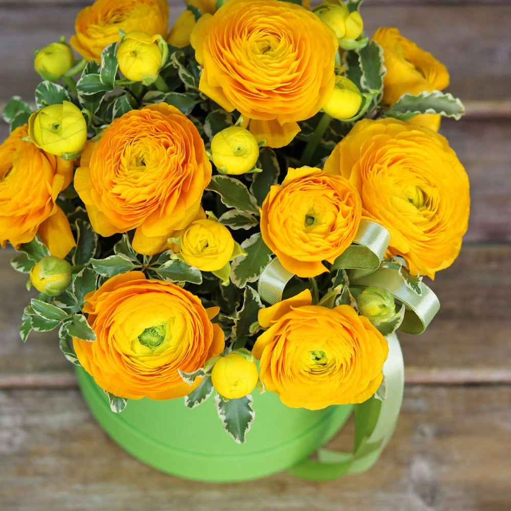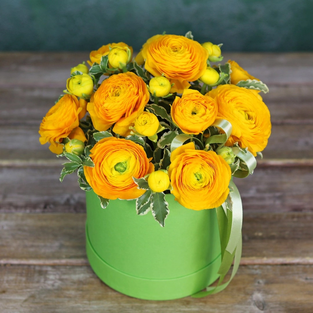Желтые ранункулюсы с зеленью в коробочке. На фотографии 9 ранункулюсов. Вы можете выбрать любое количество цветов указанное в перечне к данному букету.