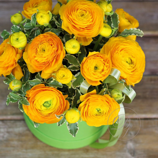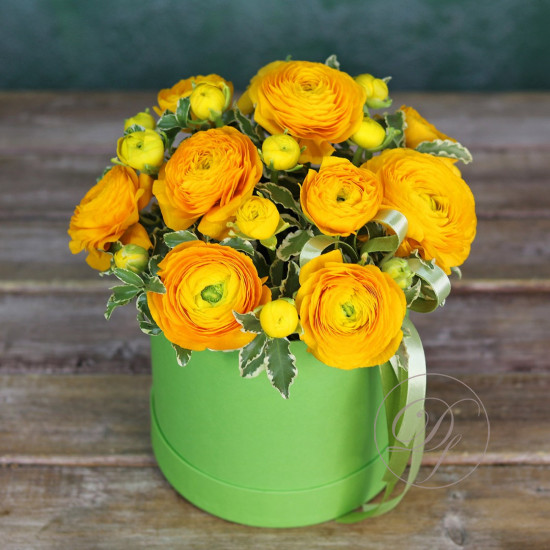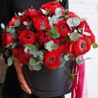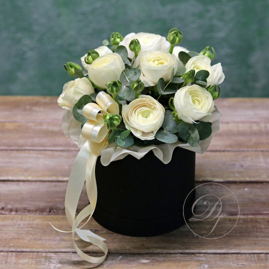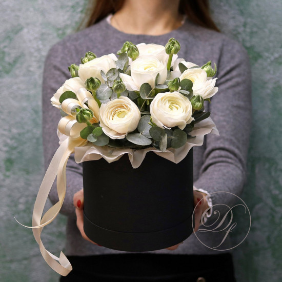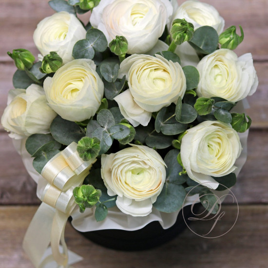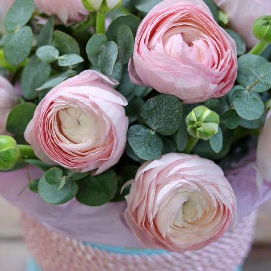 Нежно-розовые Ранункулюсы с эвкалиптом в коробочке. Вы можете выбрать любое количество цветов указанное в перечне к данному букету.