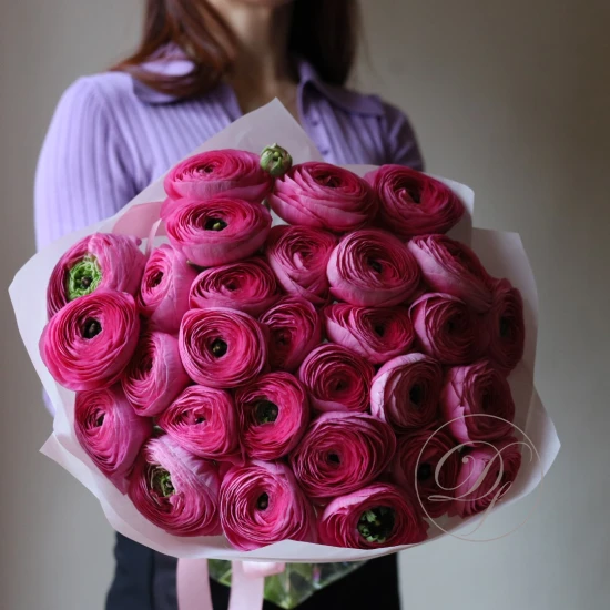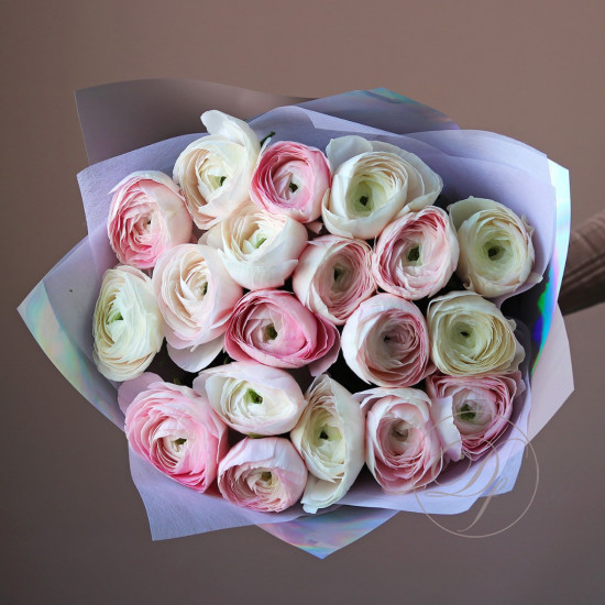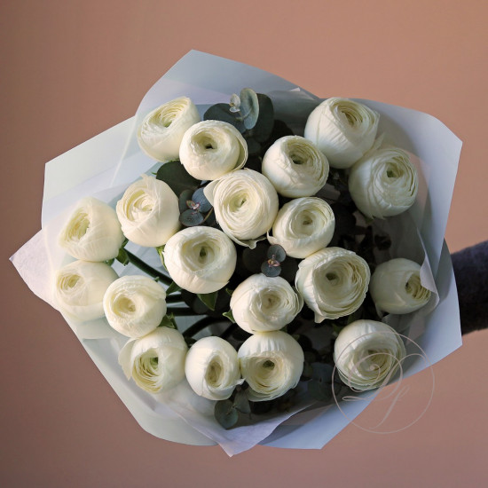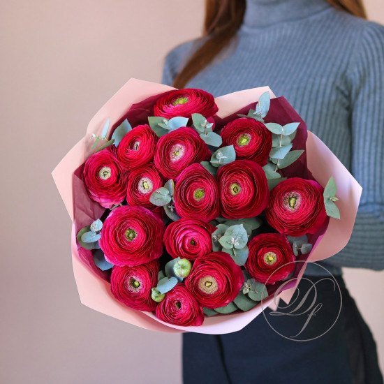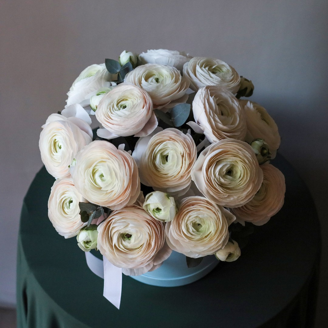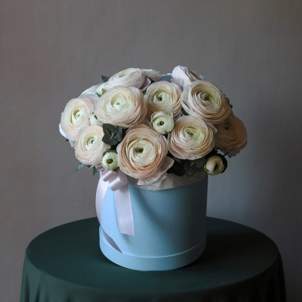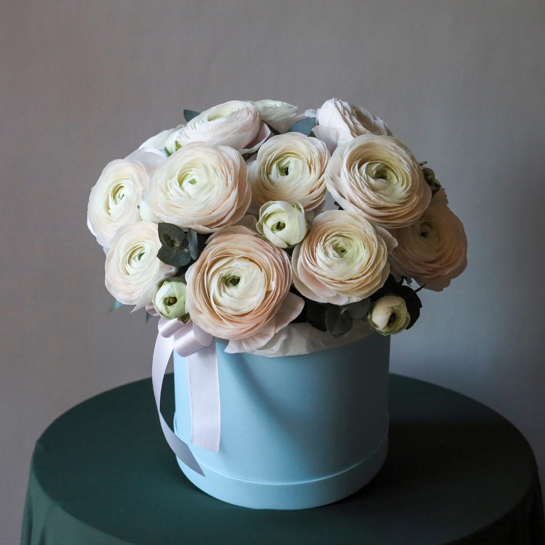 Нежно-розовые Ранункулюсы с эвкалиптом в коробочке. Вы можете выбрать любое количество цветов указанное в перечне к данному букету.