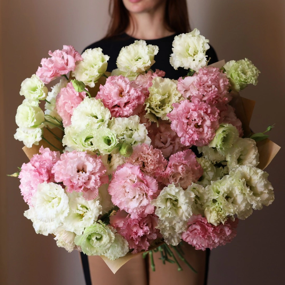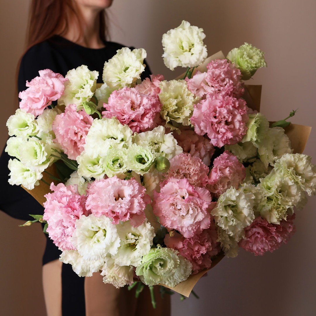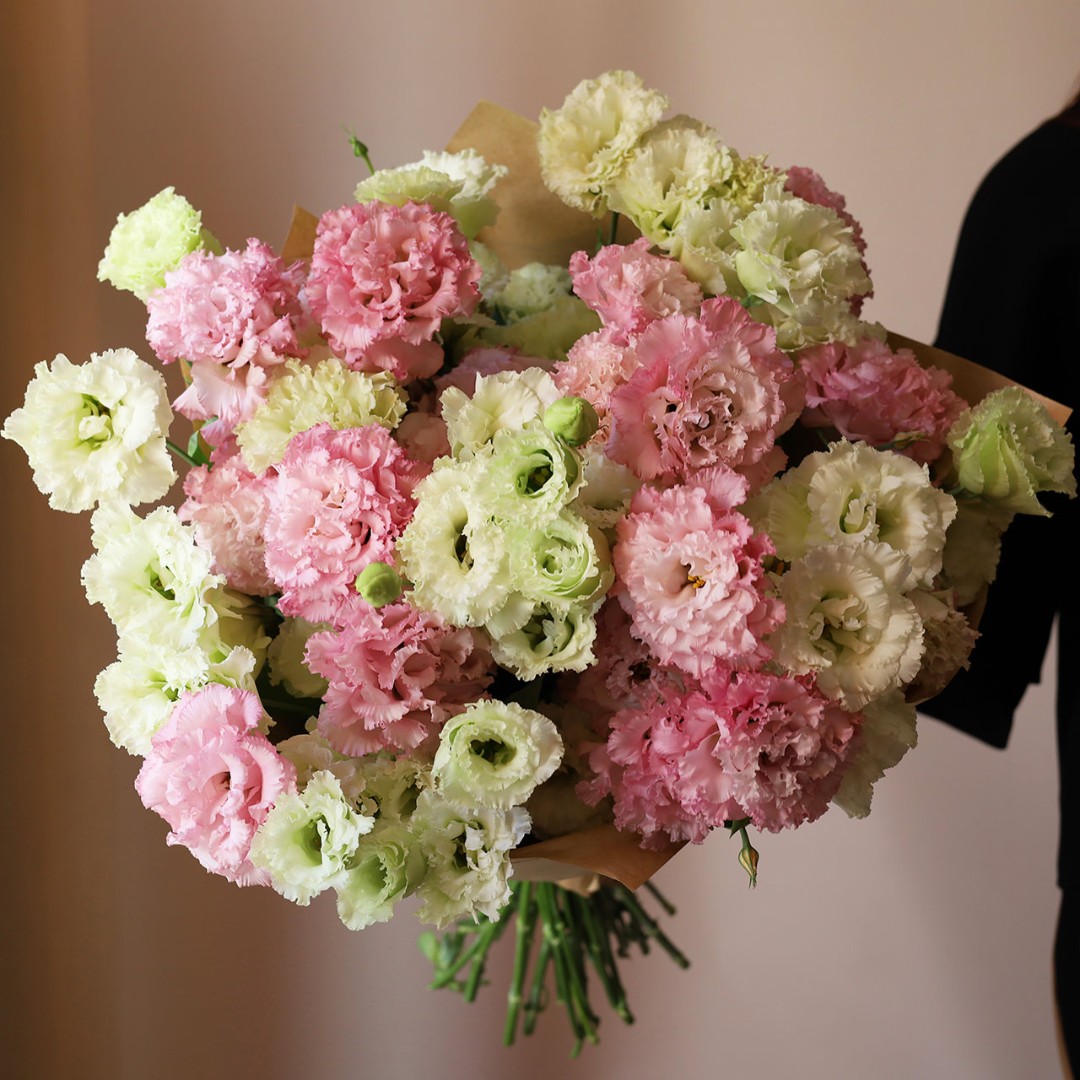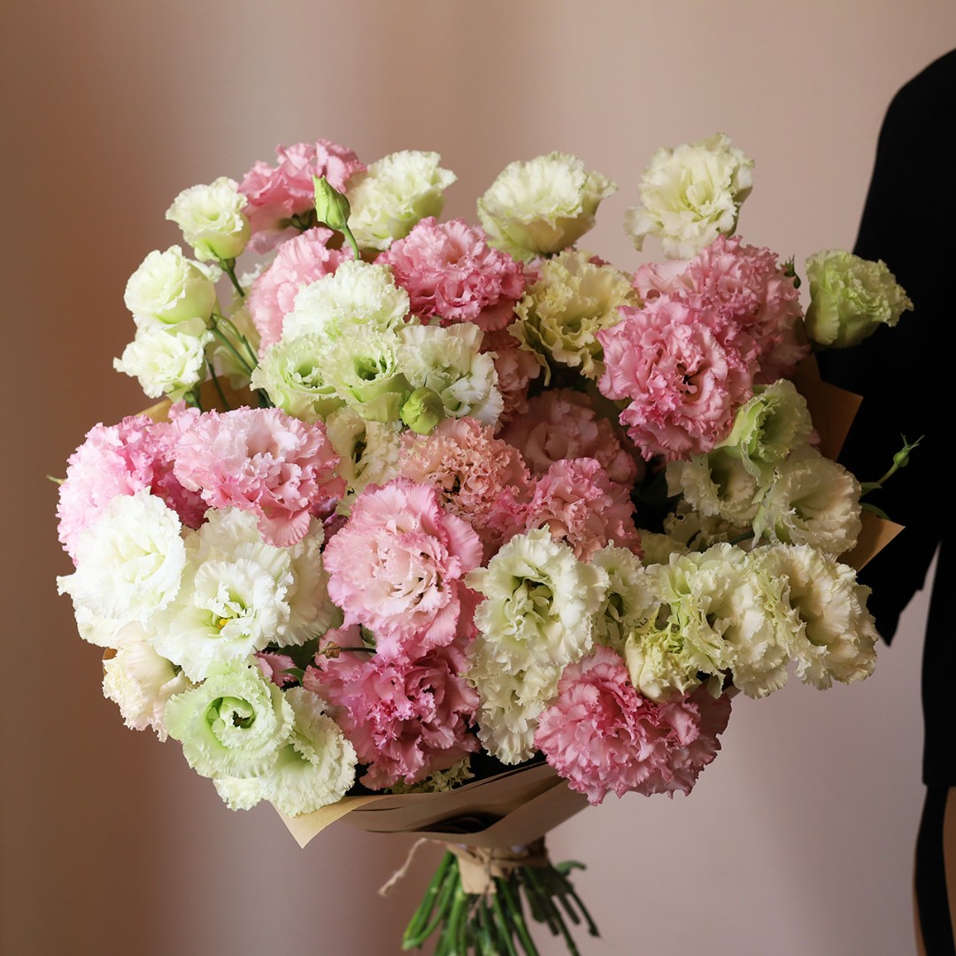Букет из розовой Эустомы (Лизиантус). На фотографии 19 веточек розовой и белой эустомы. Вы можете выбрать любое количество цветов указанное в перечне к данному букету.