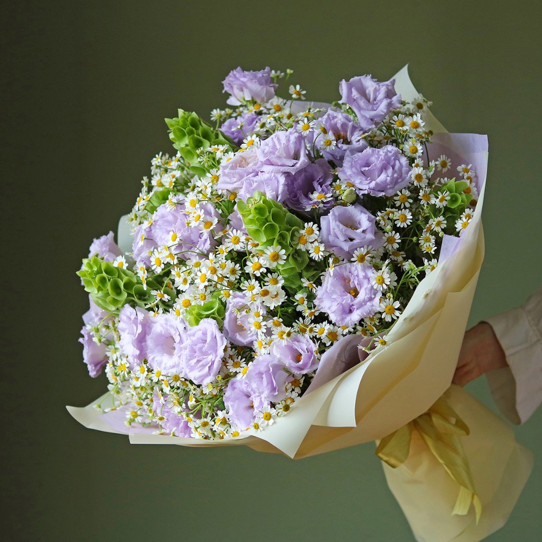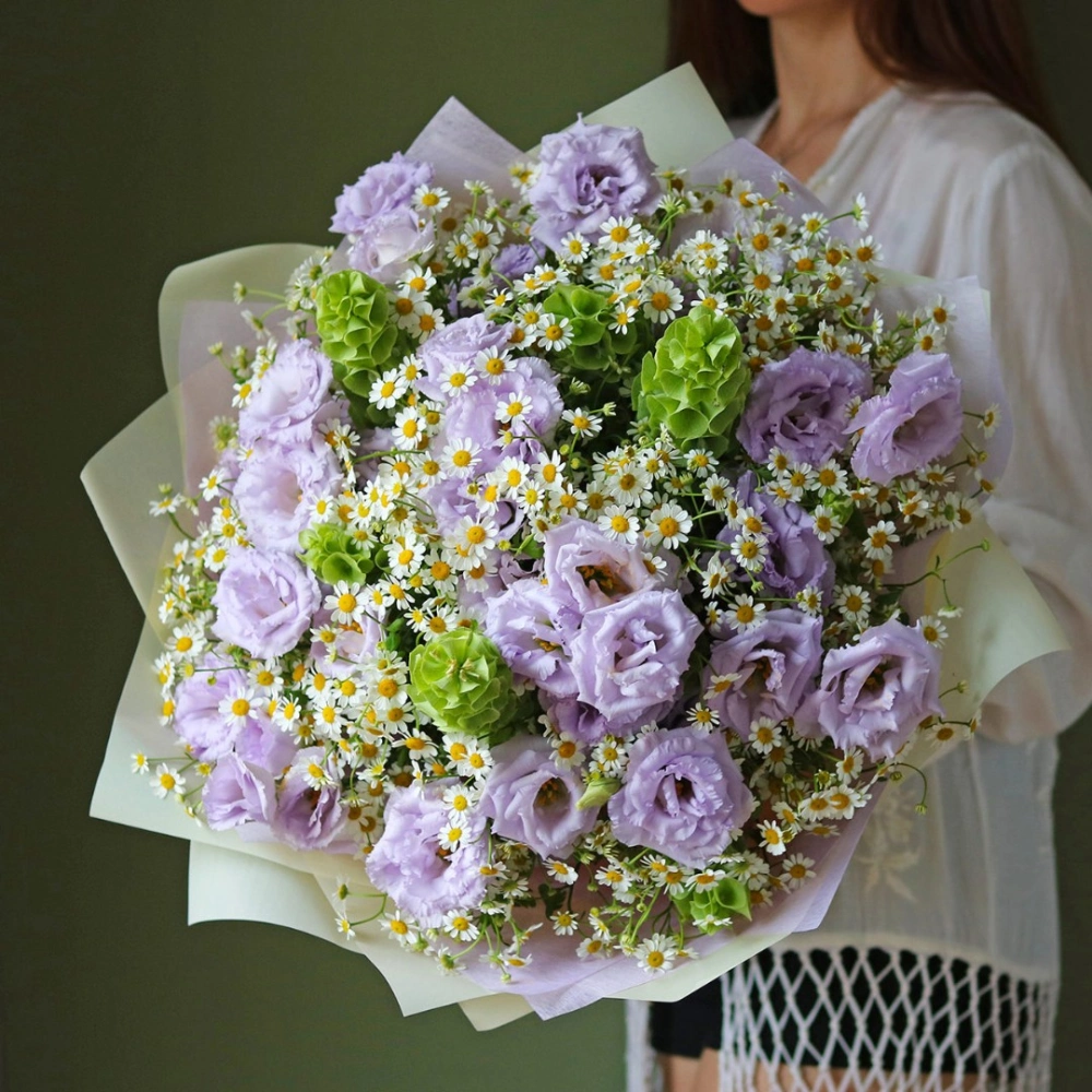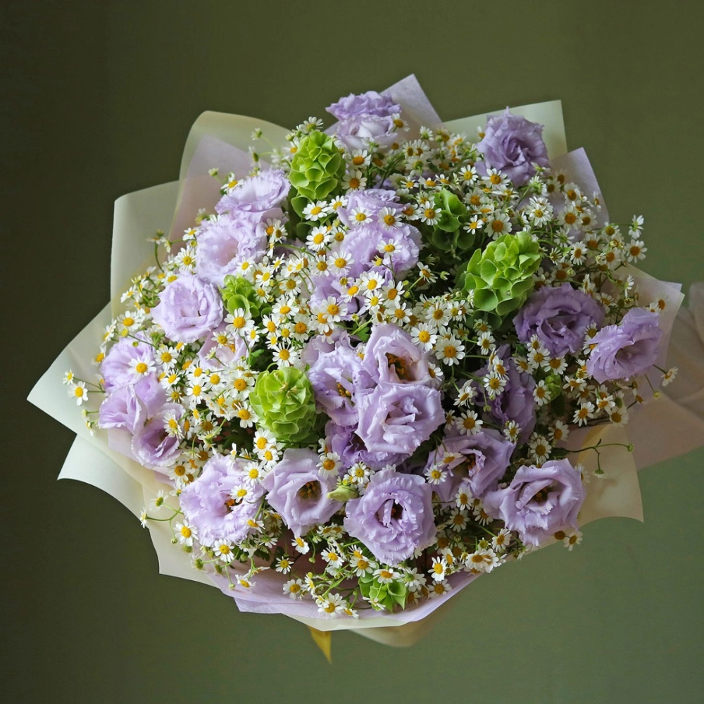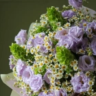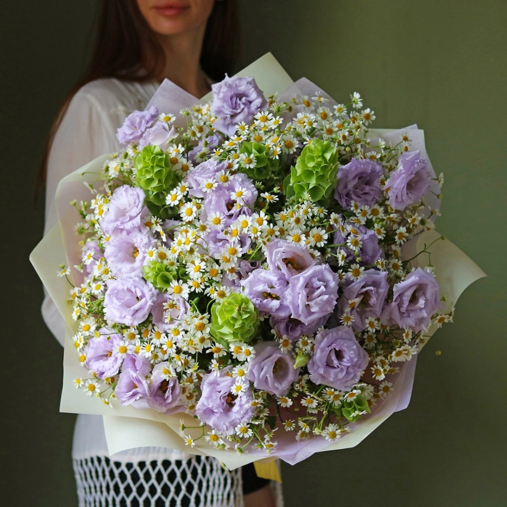 Букет из лавандовой Эустомы (лизиантус) и ромашек Камилла с зеленью. На фотографии 10 веточек эустомы, 25 ромашек, зелень декоративная. Вы можете выбрать любое количество цветов указанное в перечне к данному букету.