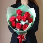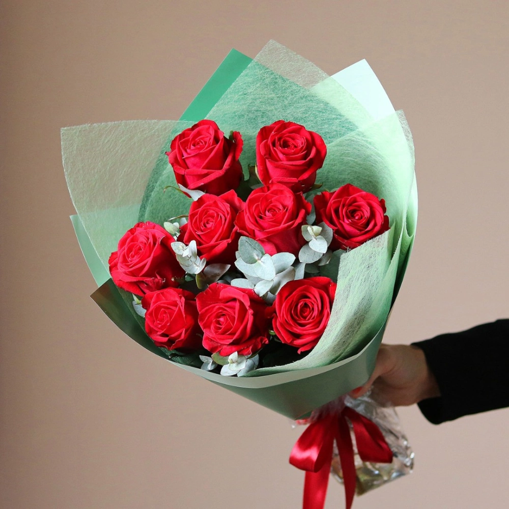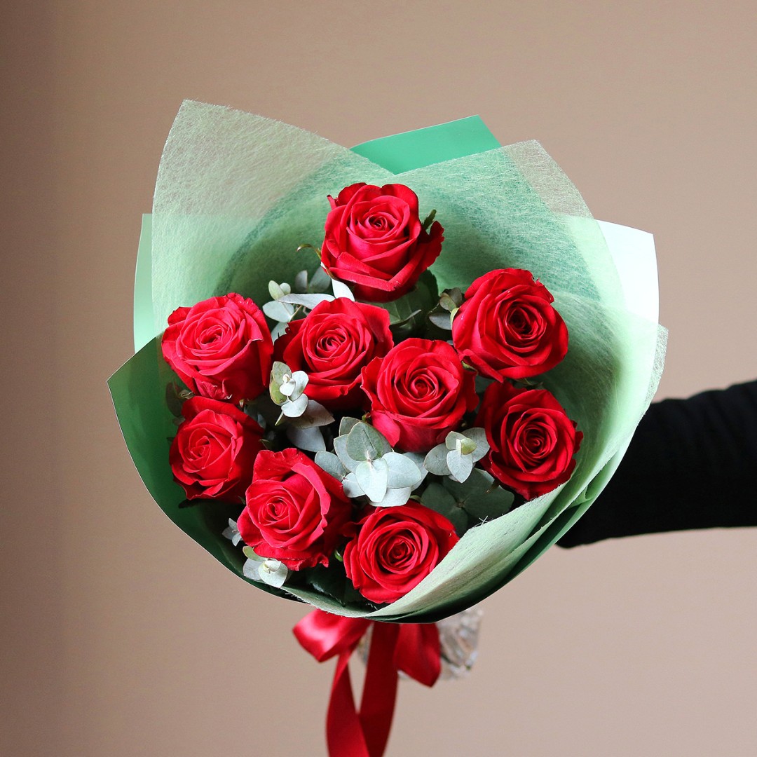 9 роз с эвкалиптом
