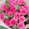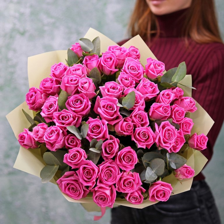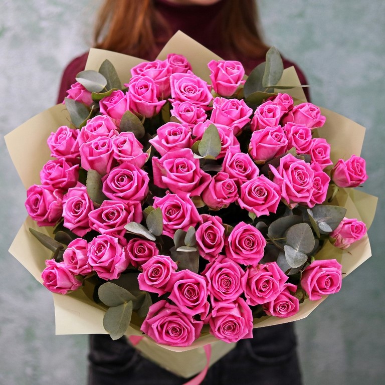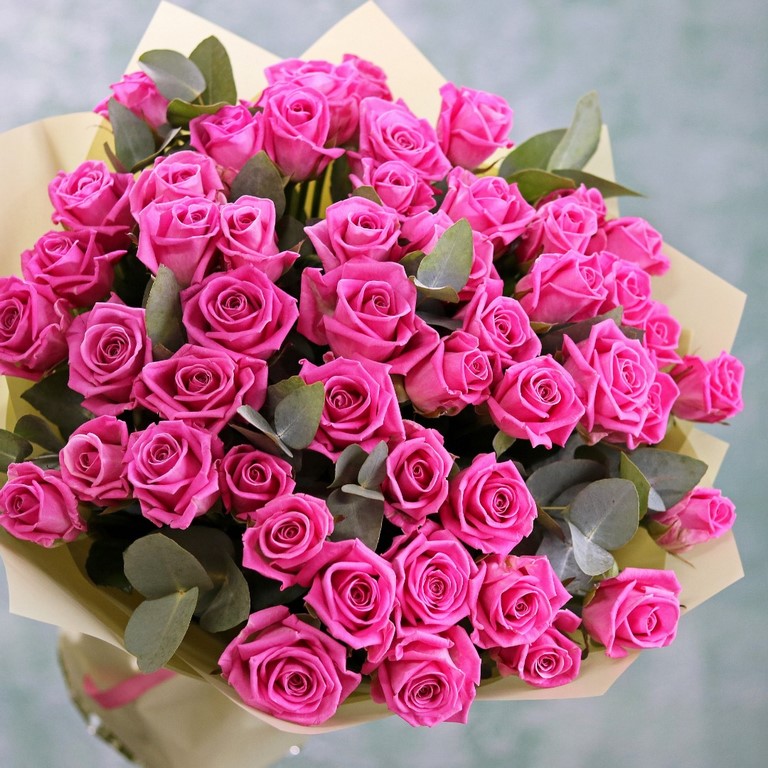 Букет из розовых роз сорта Аква с эвкалиптом. Вы можете выбрать любое количество цветов указанное в перечне к данному букету.