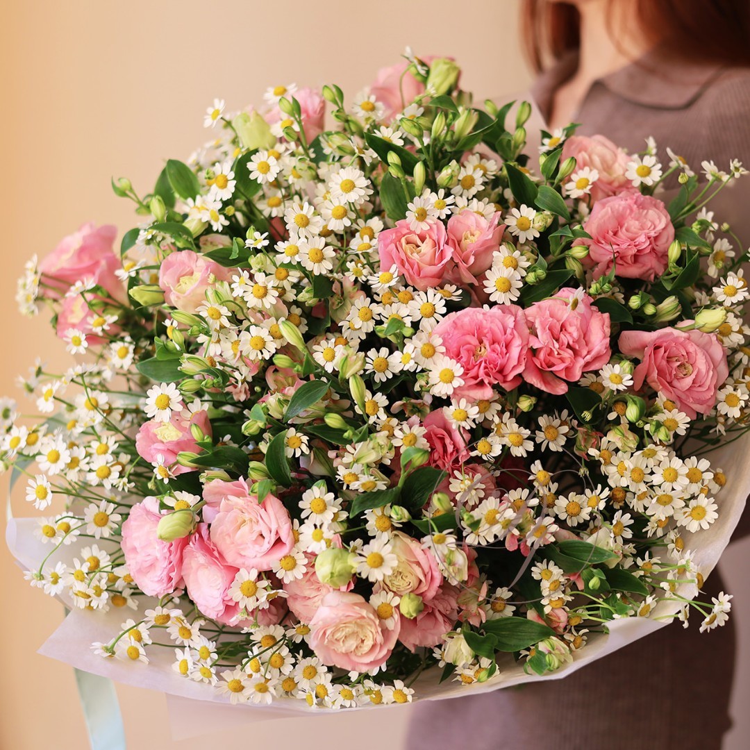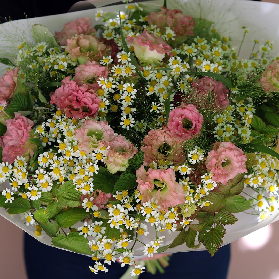 Букет из лавандовой Эустомы (лизиантус) и ромашек Камилла с зеленью. На фотографии 10 веточек эустомы, 25 ромашек, зелень декоративная. Вы можете выбрать любое количество цветов указанное в перечне к данному букету.