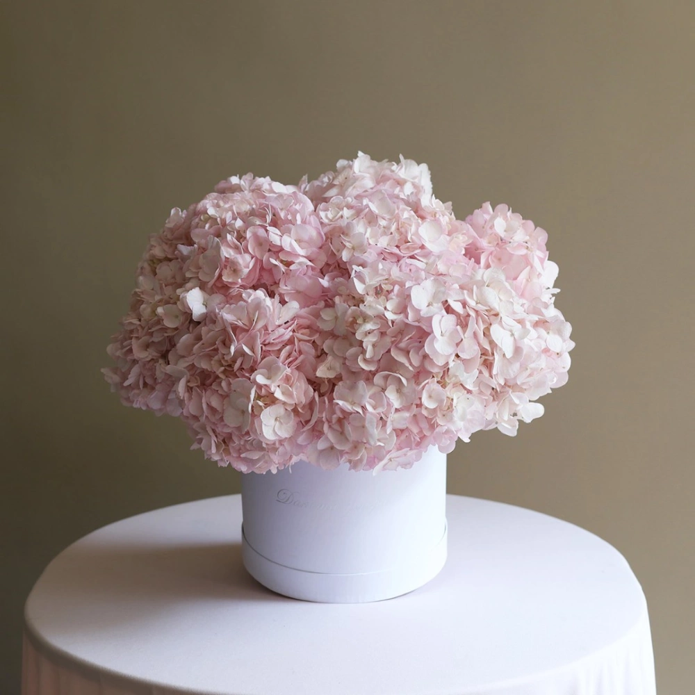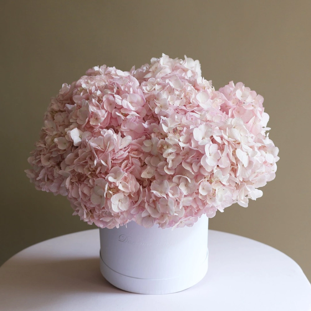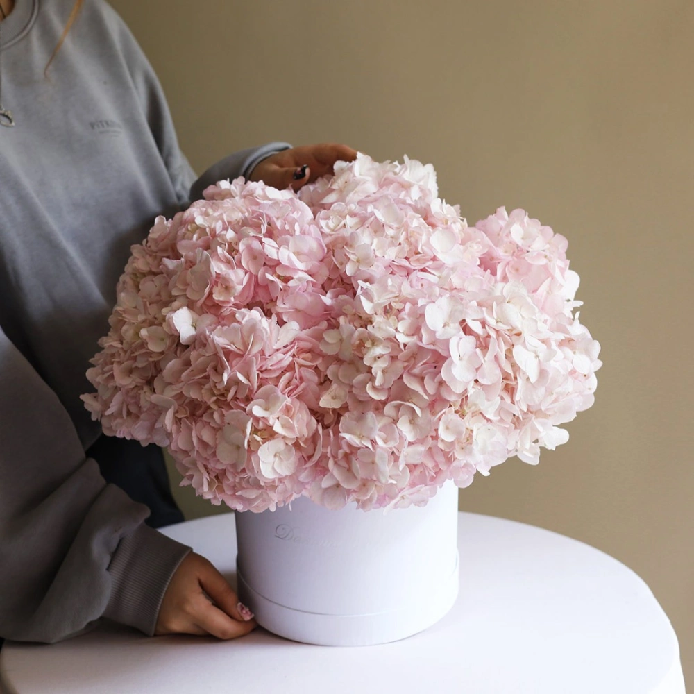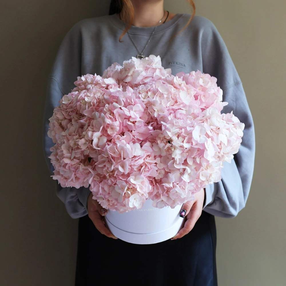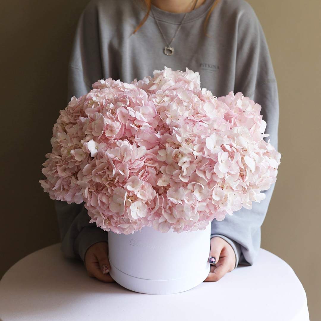 На фотографии 9 гортензий в коробке. Цветы в коробках это композиции, составленные с использованием специальной губки Oasis (пиафлор) которая пропитана водой. Для того чтобы цветы дольше оставались свежими, добавляйте в нее немного воды каждый день.