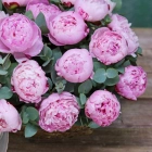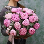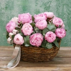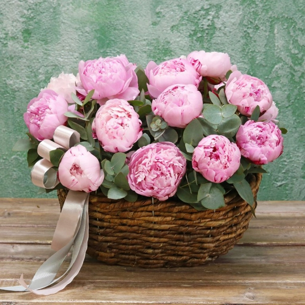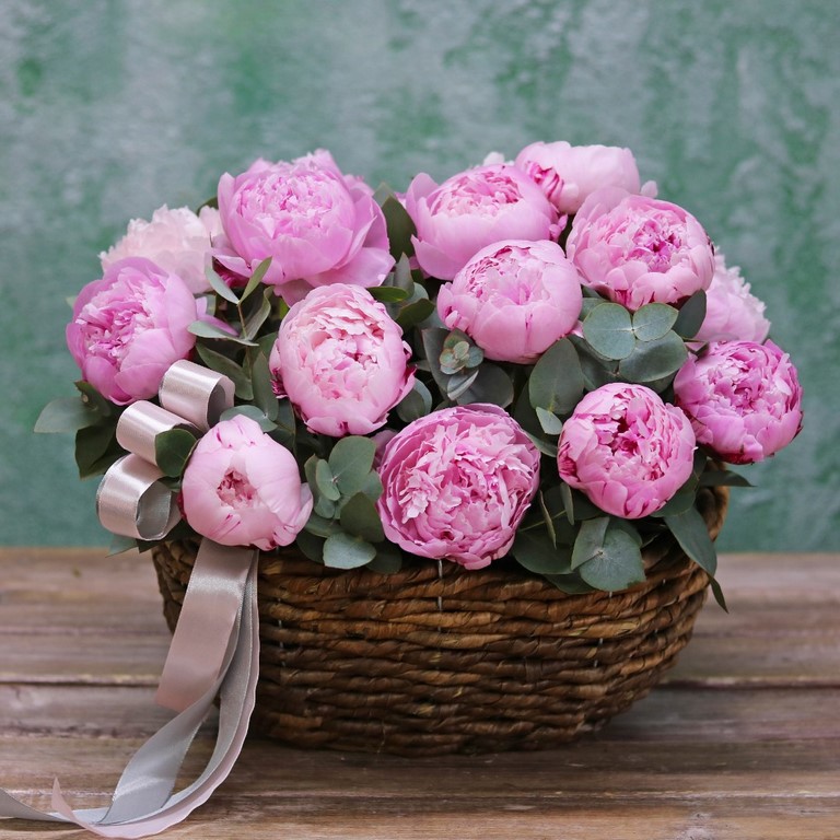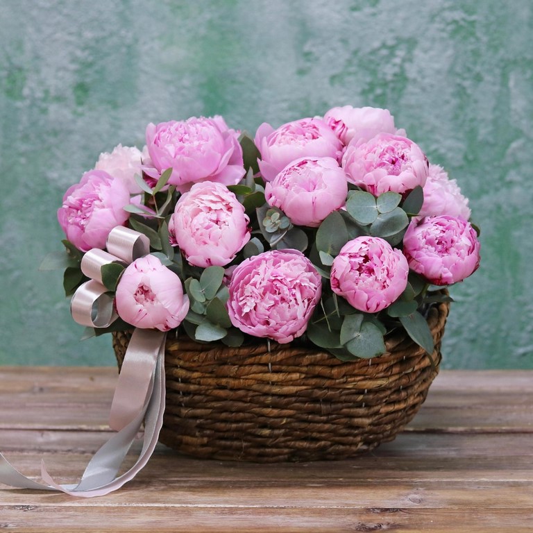 Розовые пионы Сара Бернар в корзине. На фотографии корзина с 19 пионами.