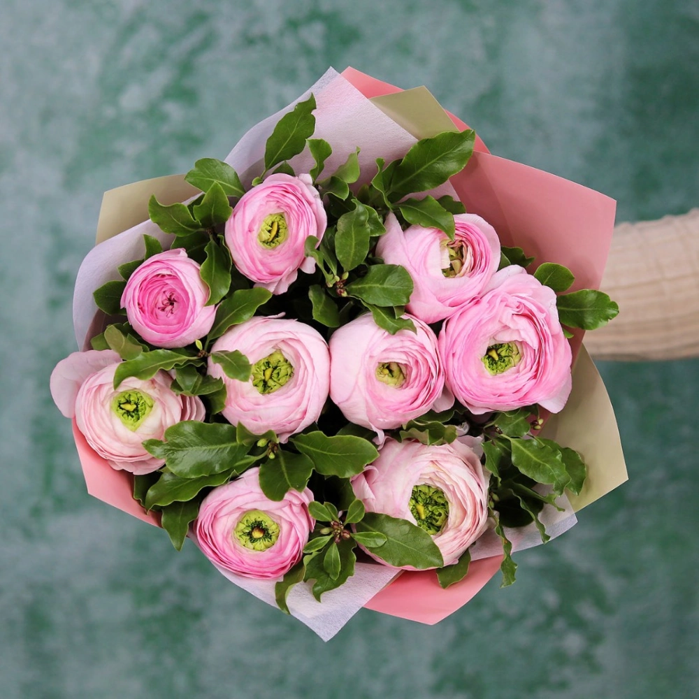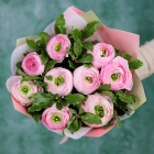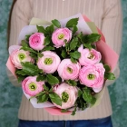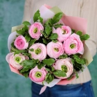 Букет из розовых ранункулюсов с зеленью. На фотографии 9 ранункулюсов в букете. Вы можете выбрать любое количество цветов указанное в перечне к данному букету.