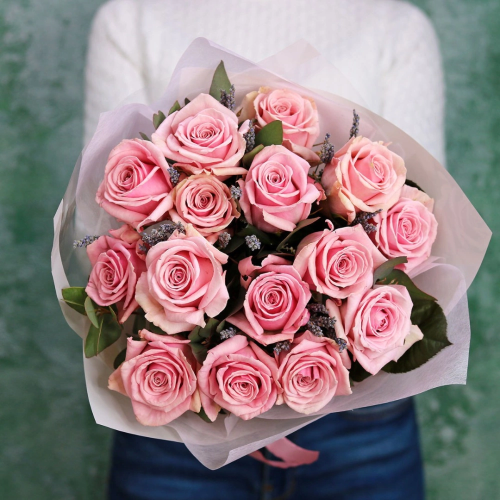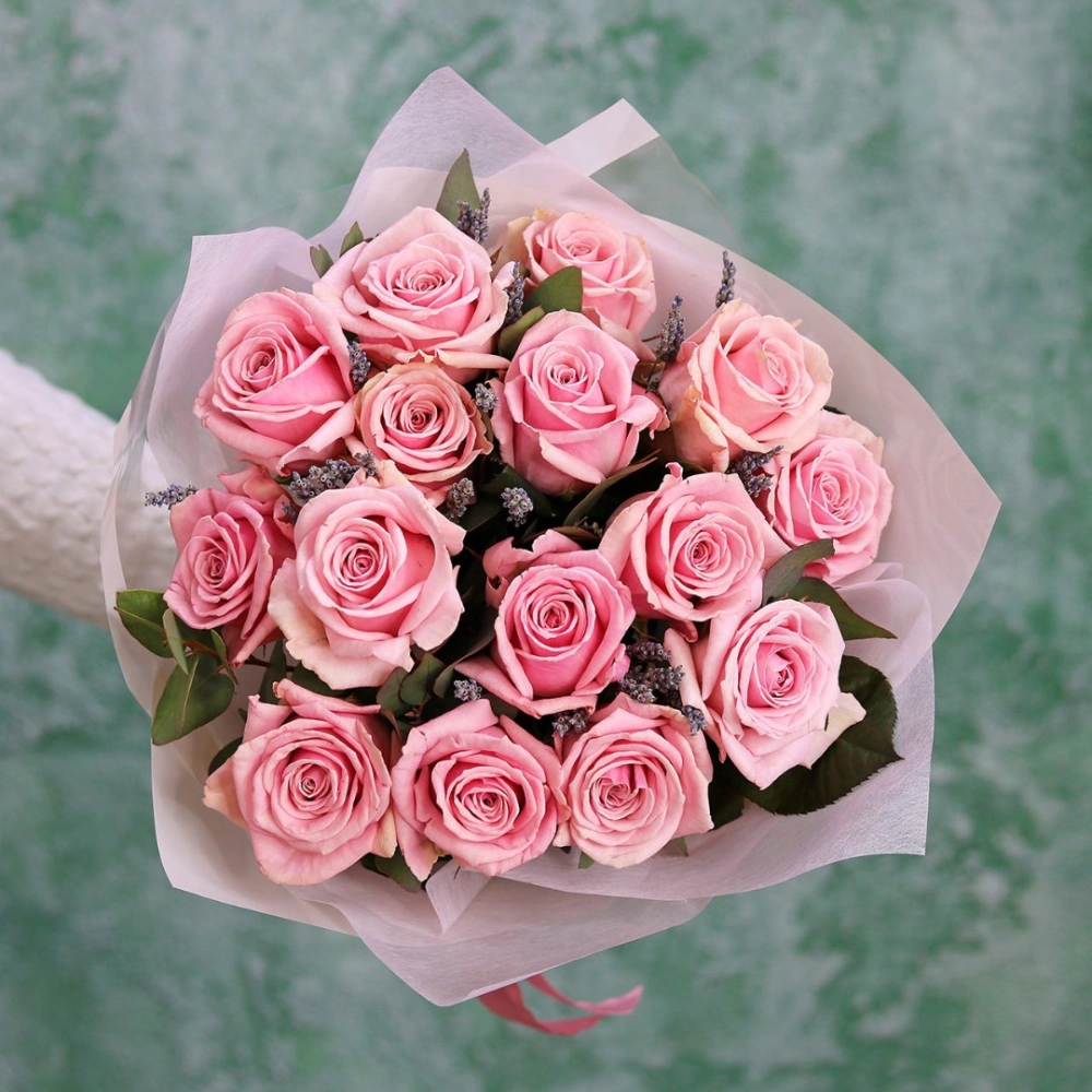 Букет из розовой розы и лаванды. Вы можете выбрать любое количество цветов указанное в перечне к данному букету.