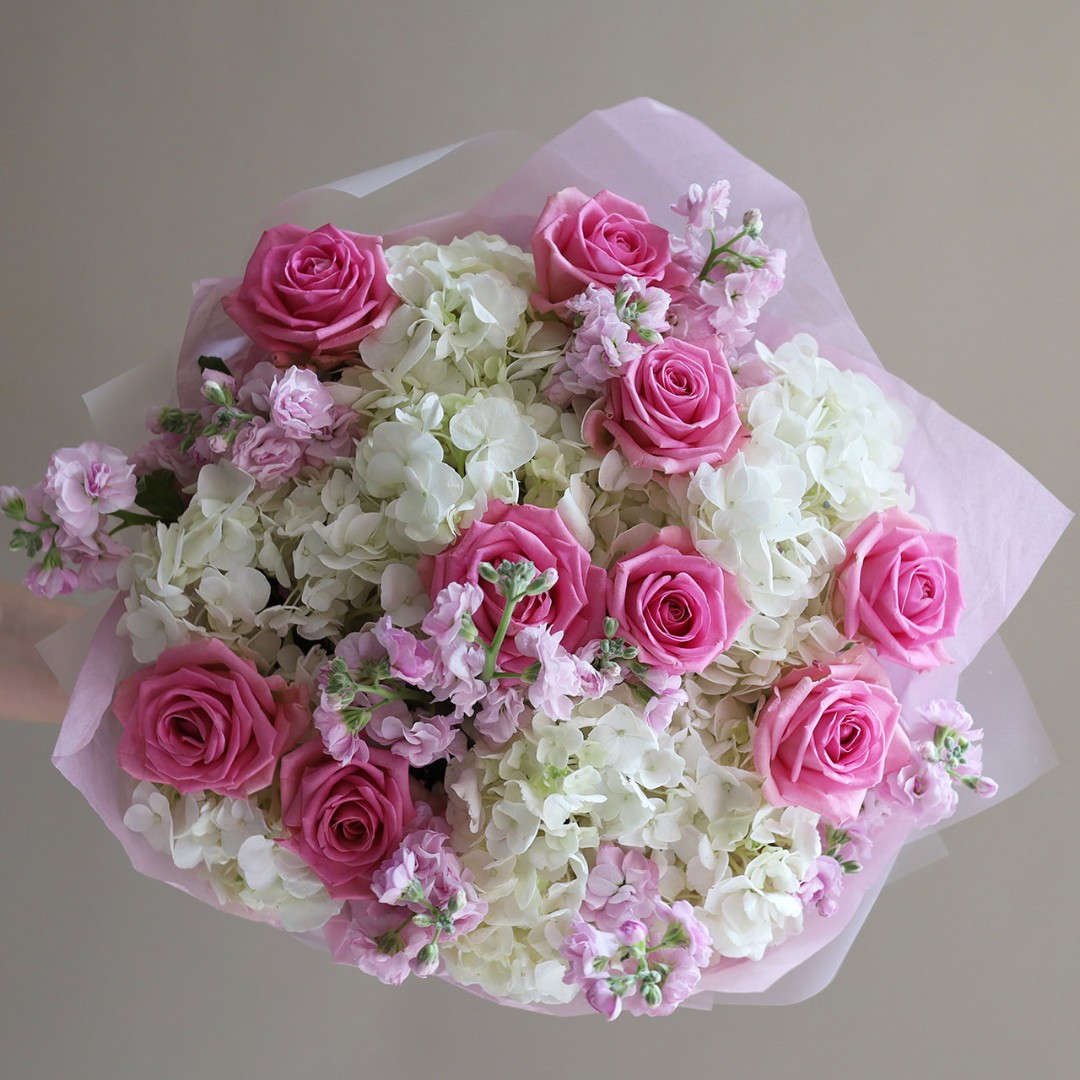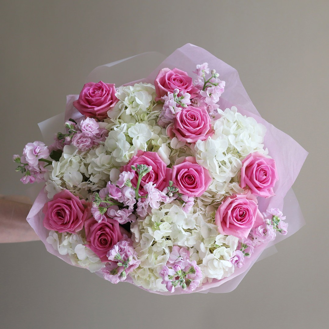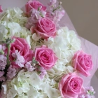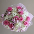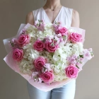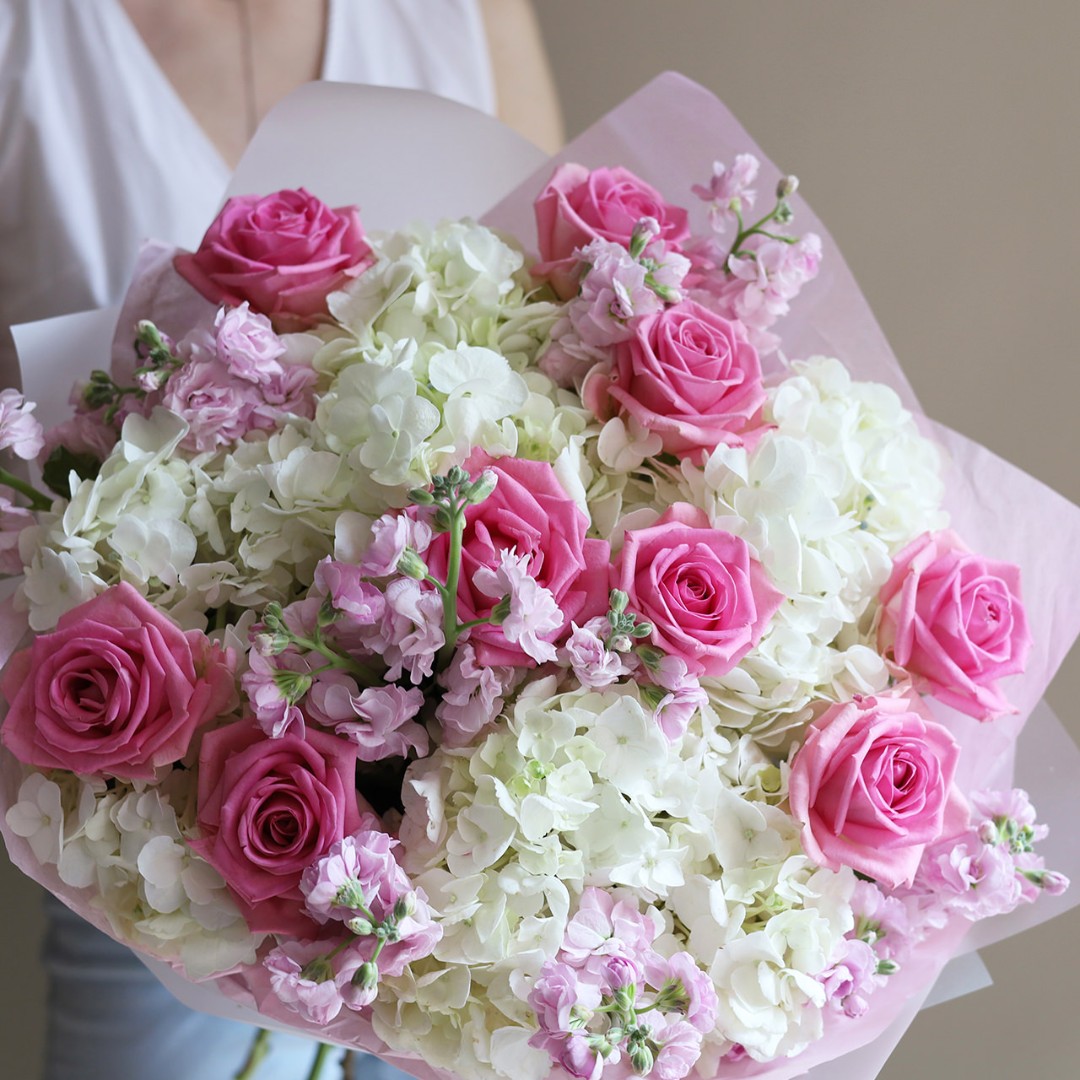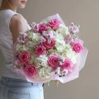 Розовый букет с розами , маттиолой и гортензией