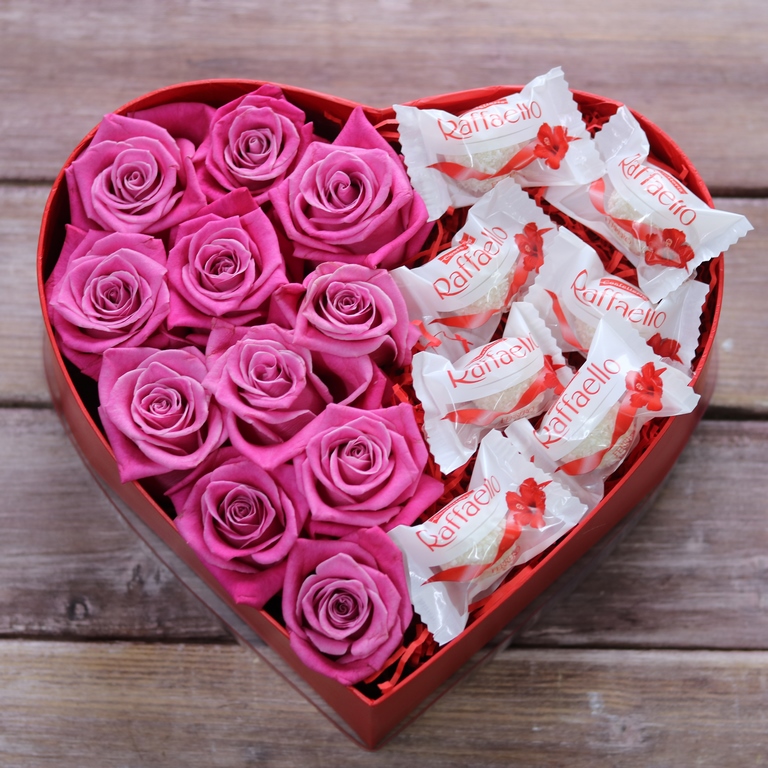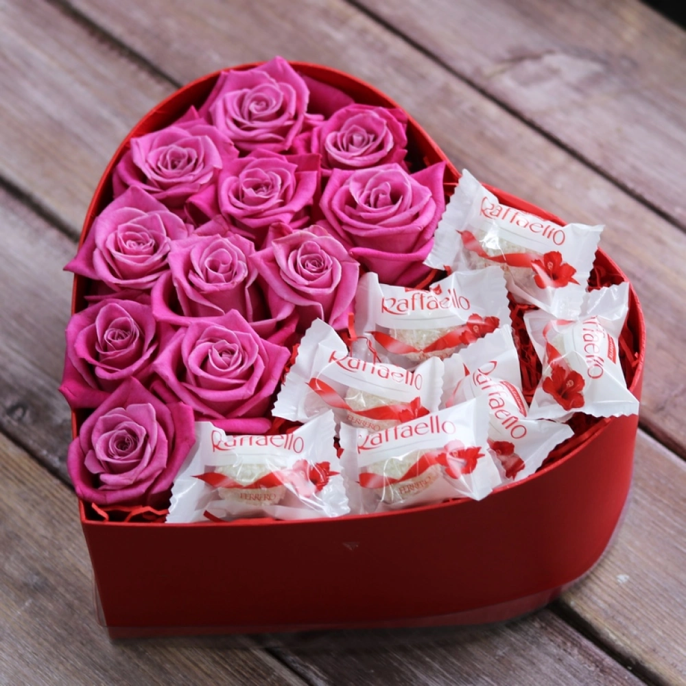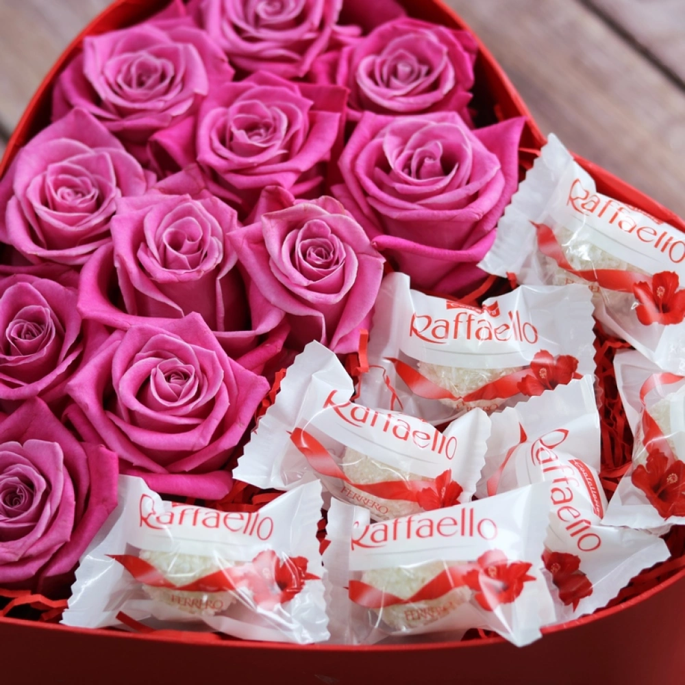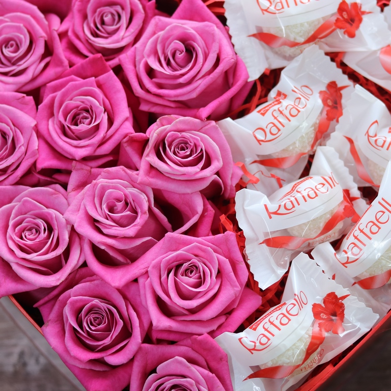 Авторские цветочные композиции в элегантных коробках различных форм, цветов, размеров, с добавлением сладостей в виде: воздушных конфет Rafaello и нежного шоколада Kinder.