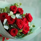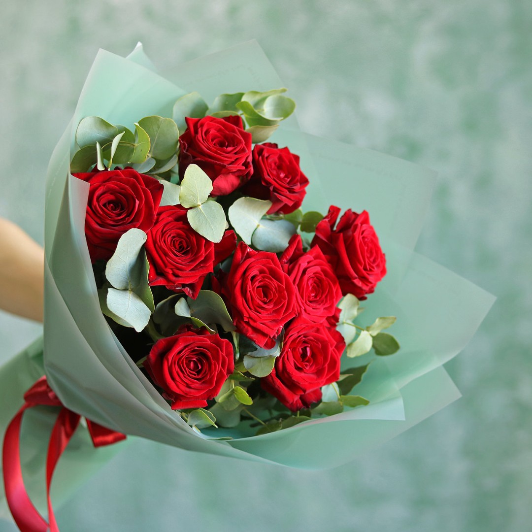 Букет из красных роз с зеленью эвкалипта. Вы можете выбрать любое количество роз, указанное в перечне к данному букету.