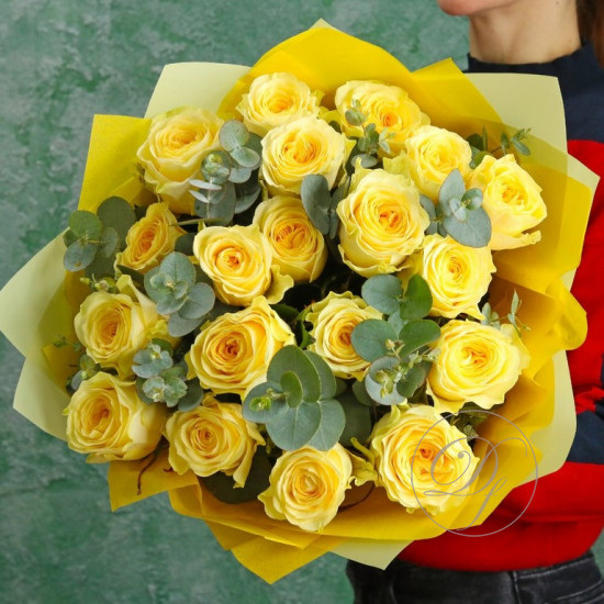 Букет из желтых роз с эвкалиптом. Вы можете выбрать любое количество цветов указанное в перечне к данному букету.