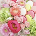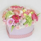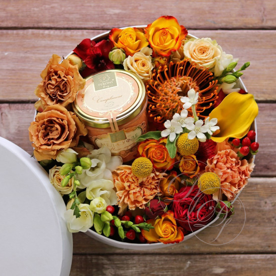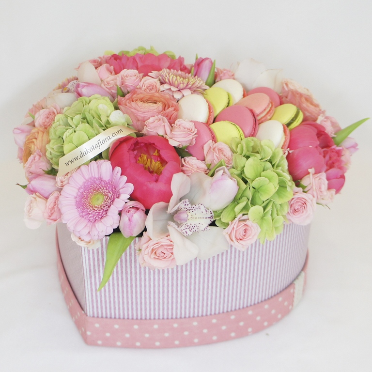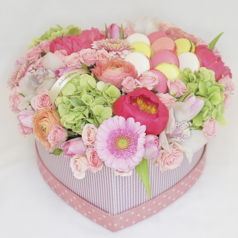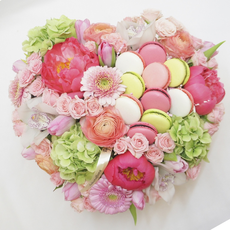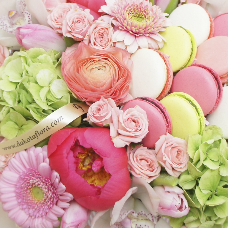 Авторские цветочные композиции в элегантных коробках различных форм, цветов, размеров, с добавлением сладостей в виде: баночки меда peroni, французских пирожных macarons, имбирных пряников и свежих ягод.
