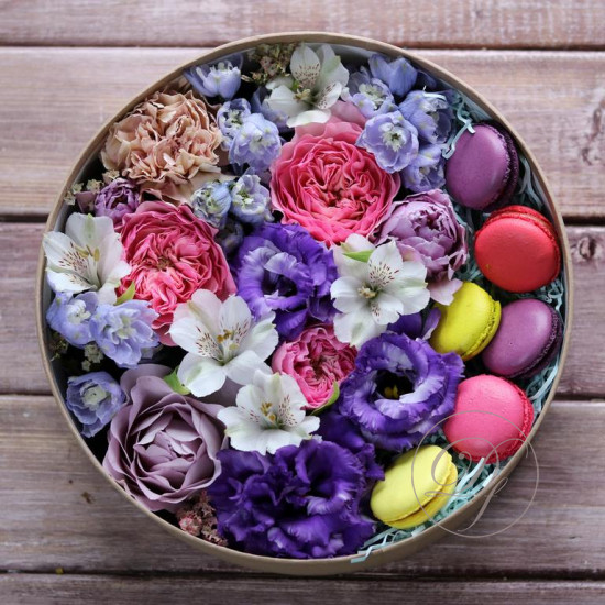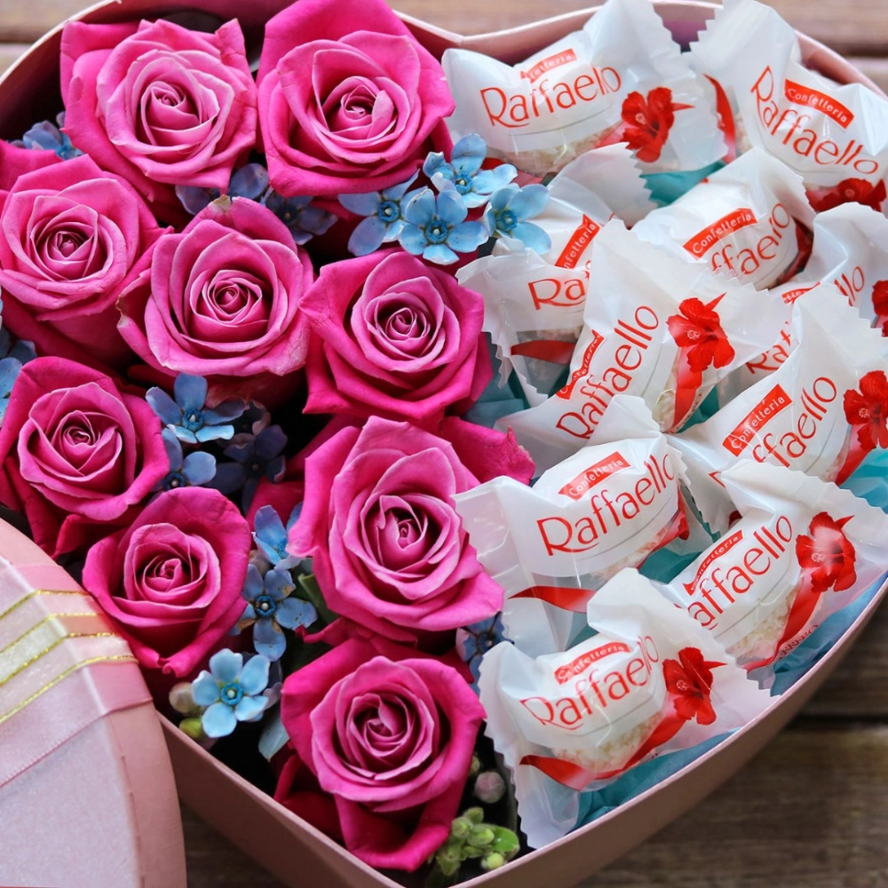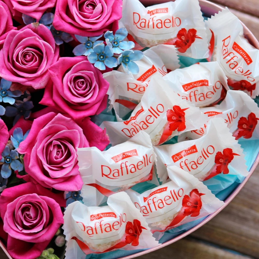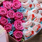 Авторские цветочные композиции в элегантных коробках различных форм, цветов, размеров, с добавлением сладостей в виде: воздушных конфет Rafaello и нежного шоколада Kinder.