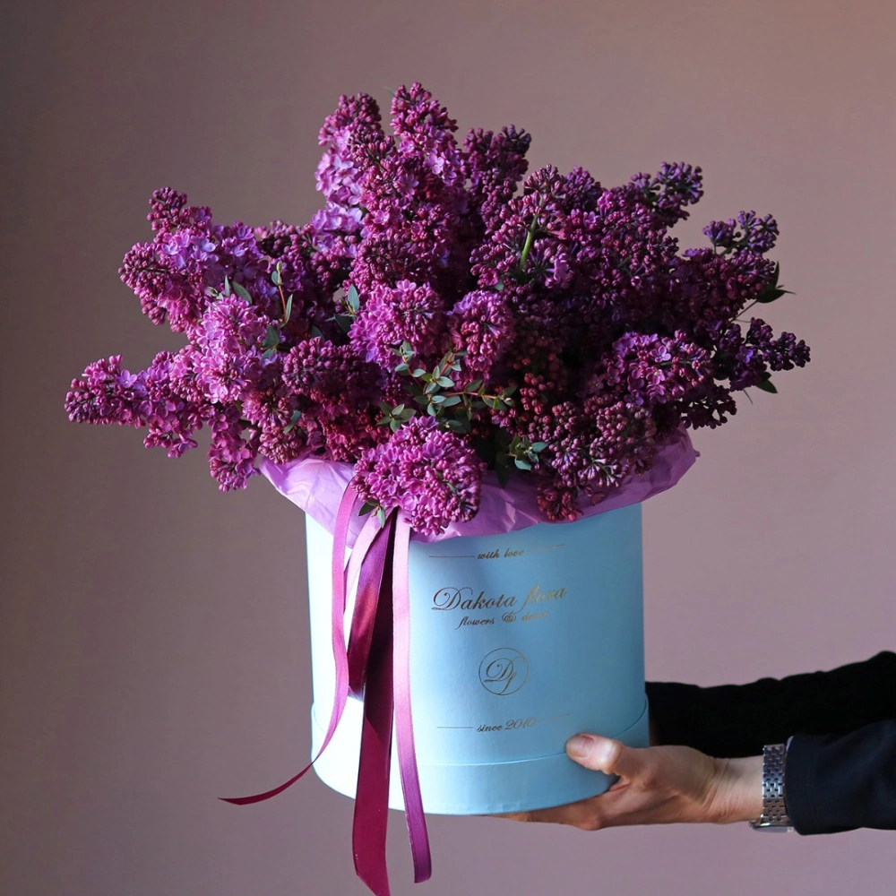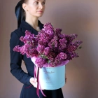 Коробка с сезонной Сиренью. Цвет насыщенно-фиолетового цвета c ярко- выраженным ароматом. Букет из фиолетовой сирени на заказ с доставкой по Москве. Вы можете выбрать любое количество цветов указанное в перечне к данному букету.