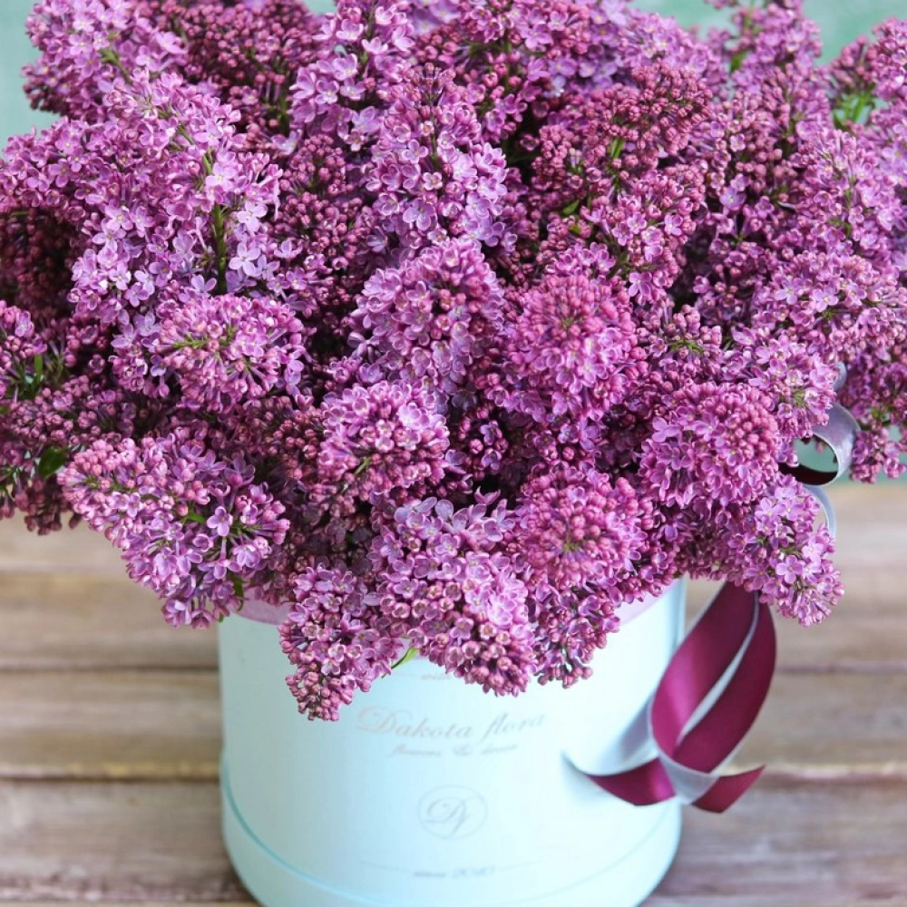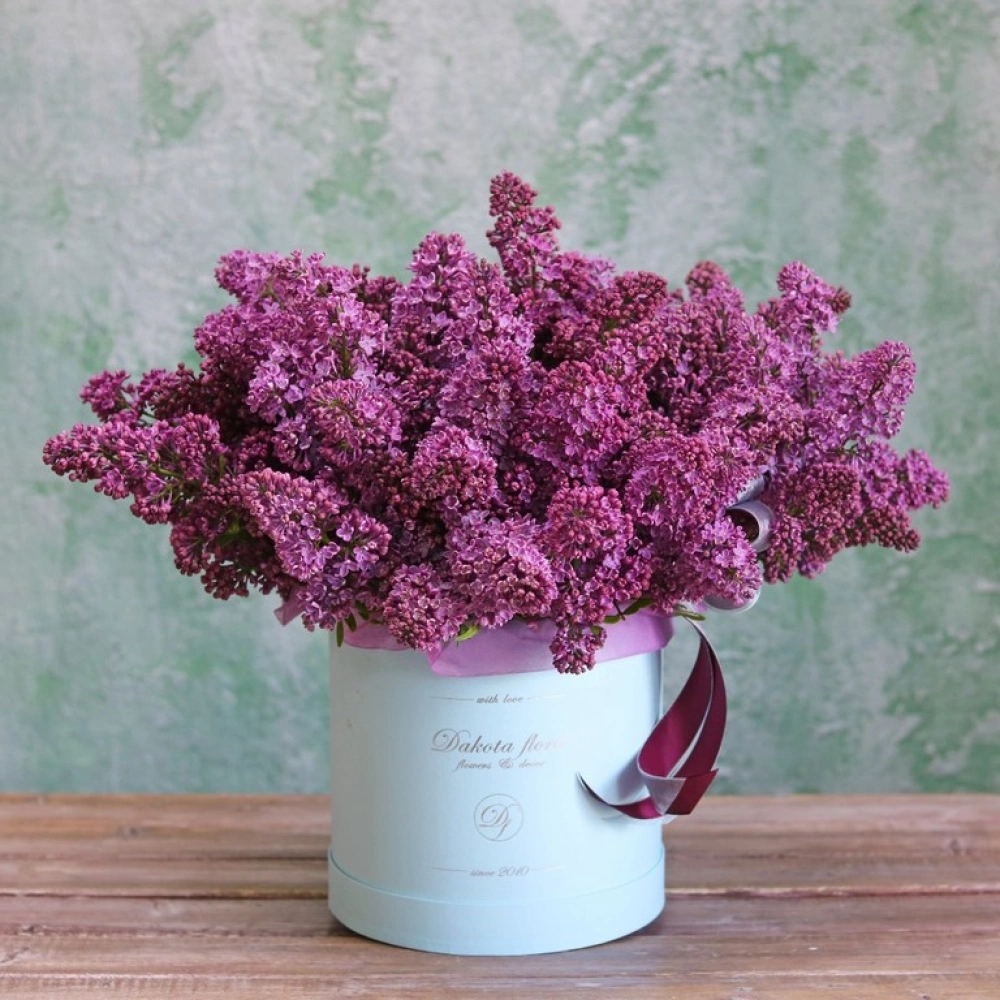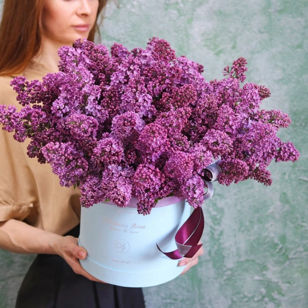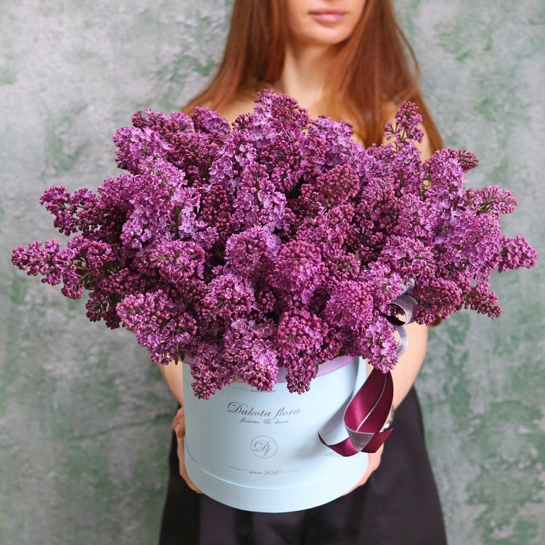 На фотографии 19 веточек сирени в коробке. Цветы в коробке это композиции, составленные с использованием специальной губки Oasis (пиафлор) которая пропитана водой. Для того чтобы цветы дольше оставались свежими, добавляйте в нее немного воды каждый день.