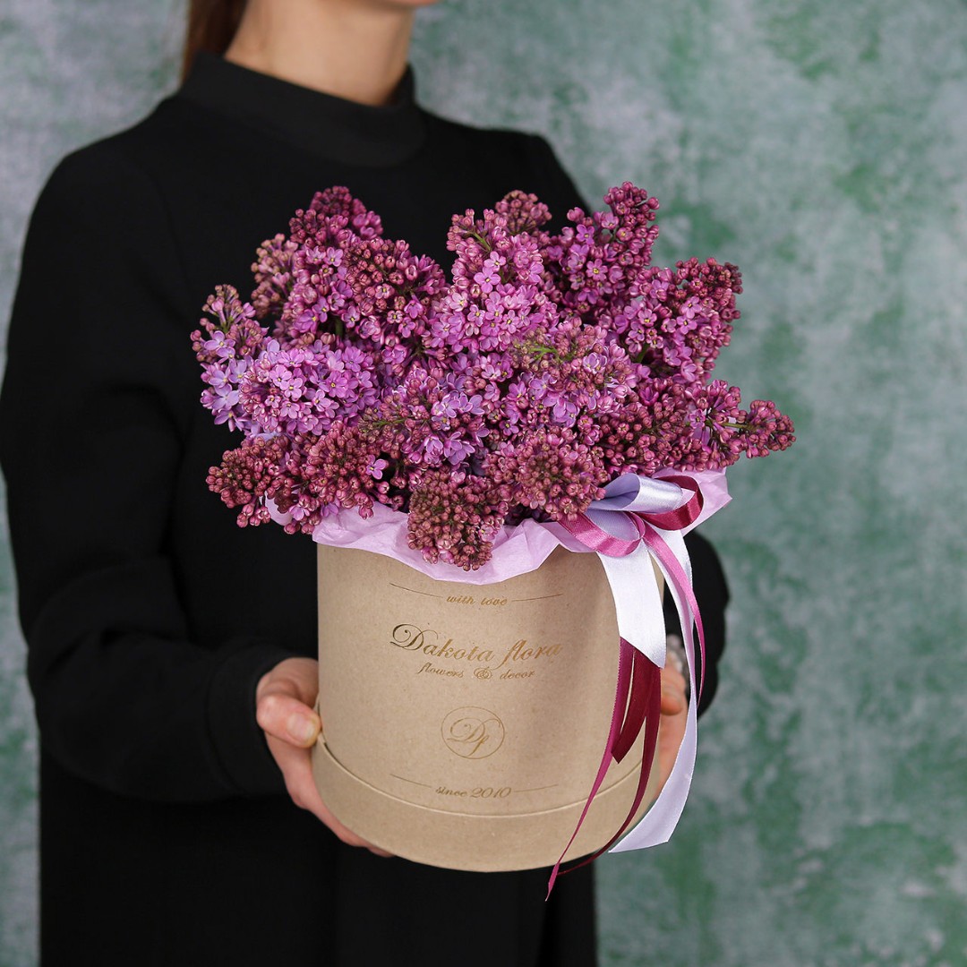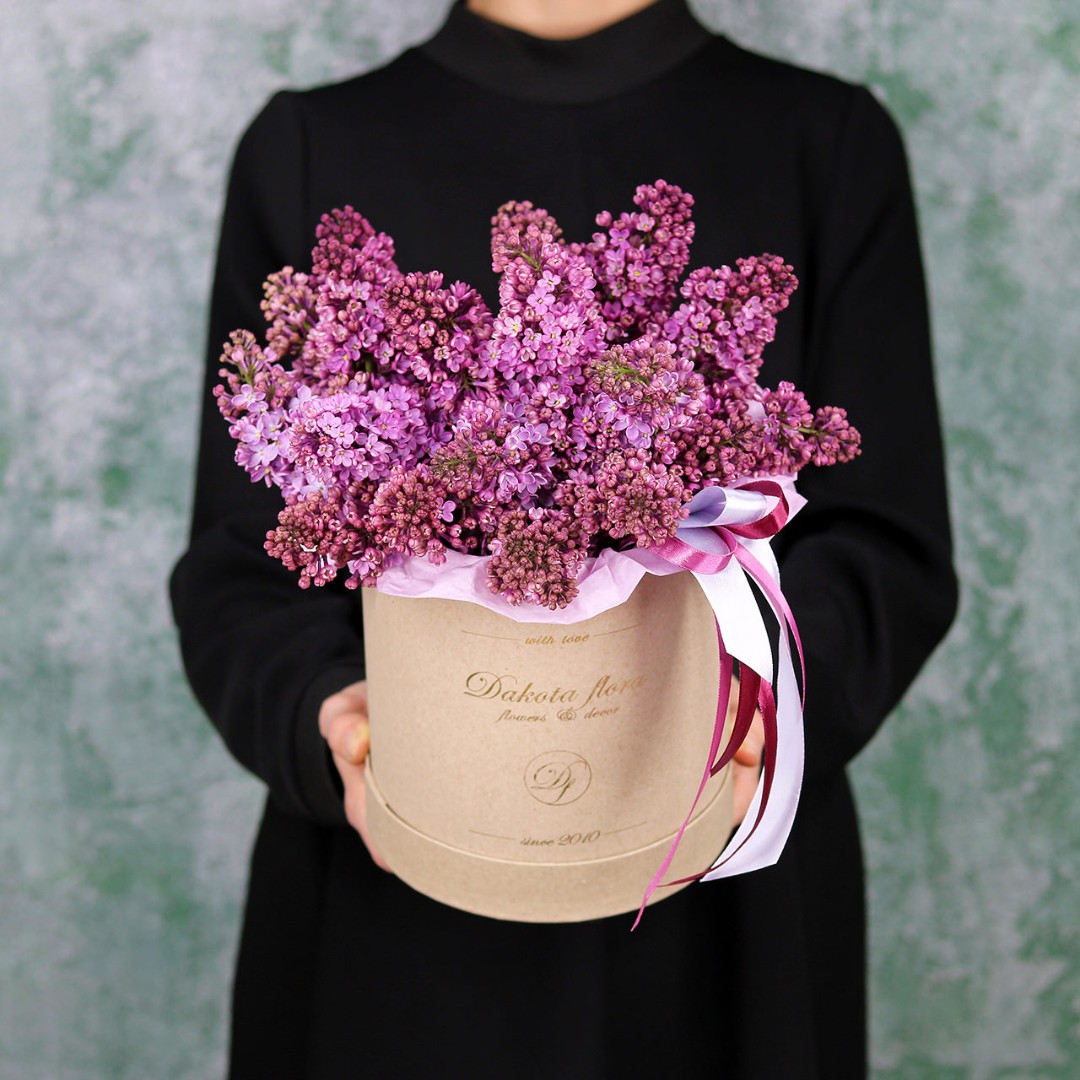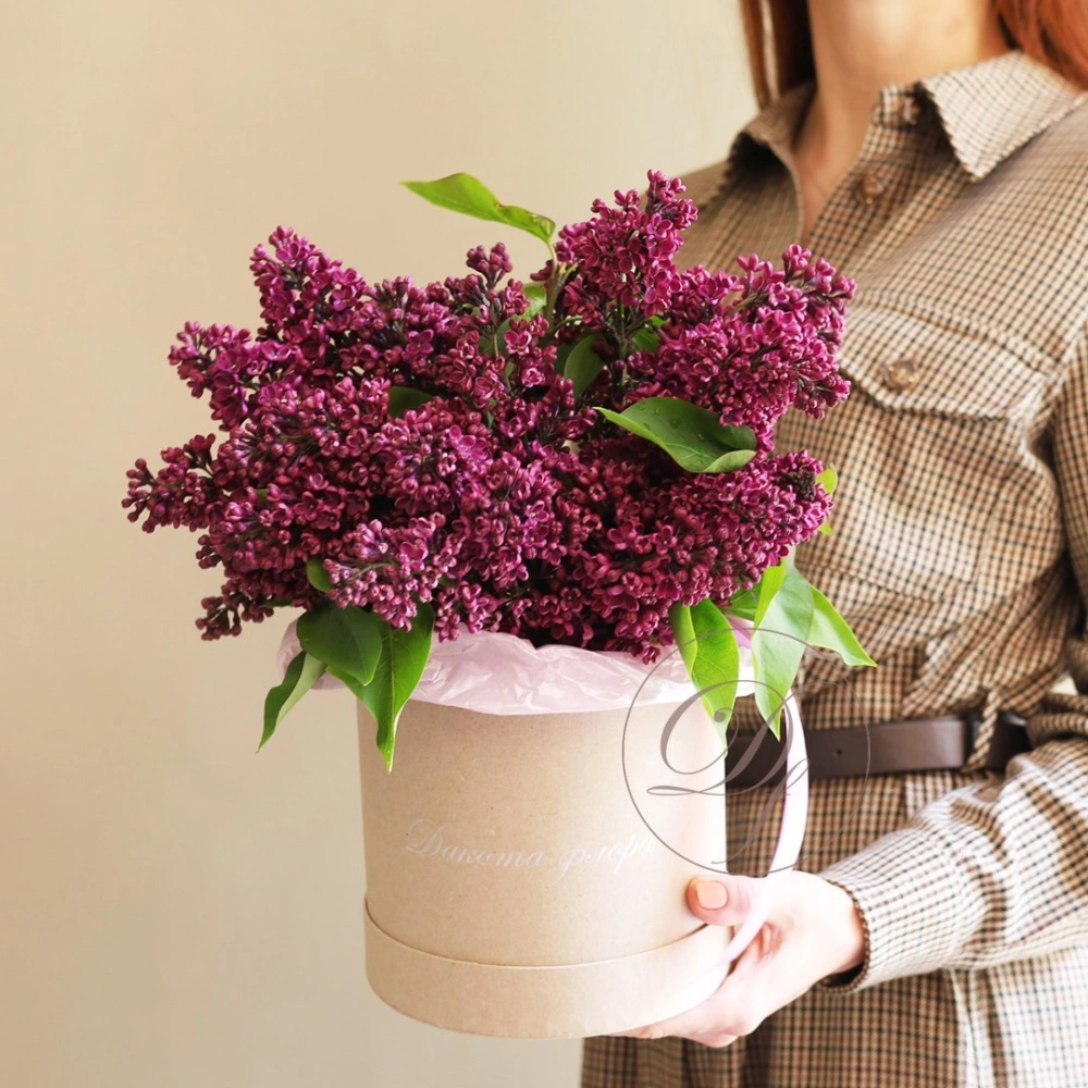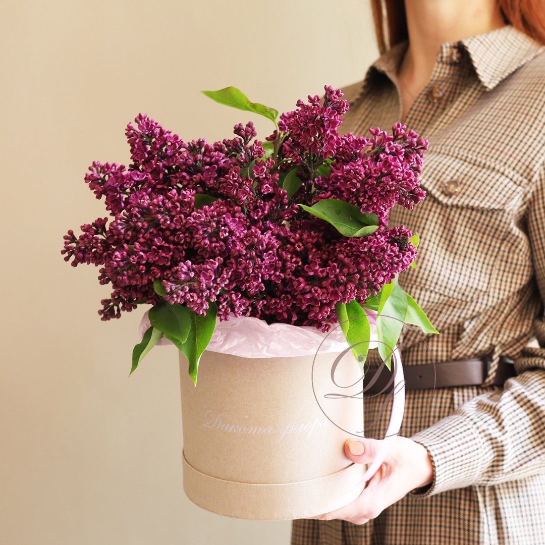 Коробка с сезонной Сиренью. Цвет насыщенно-фиолетового цвета c ярко- выраженным ароматом. Букет из фиолетовой сирени на заказ с доставкой по Москве. Вы можете выбрать любое количество цветов указанное в перечне к данному букету.