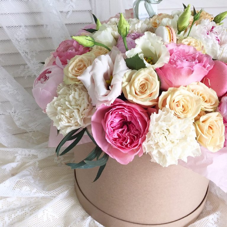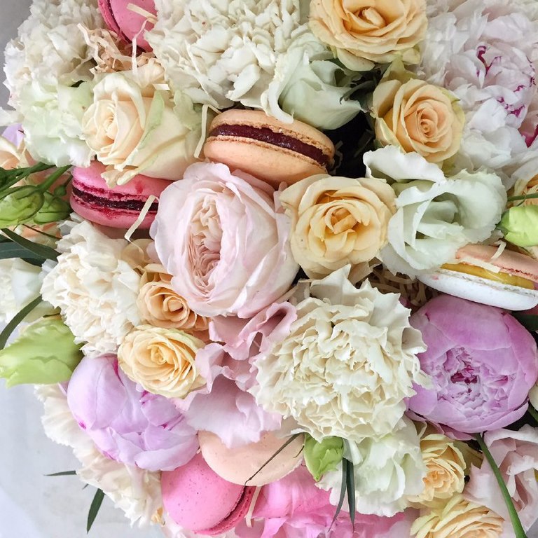 Авторские цветочные композиции в элегантных коробках различных форм, цветов, размеров, с добавлением сладостей в виде: французских пирожных macarons.