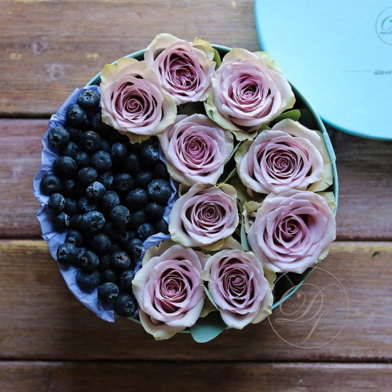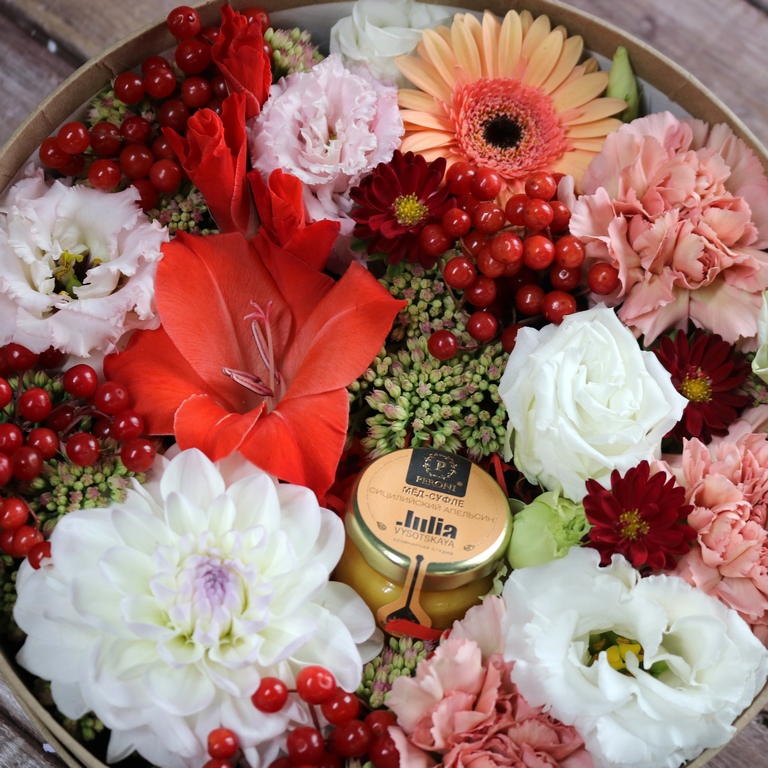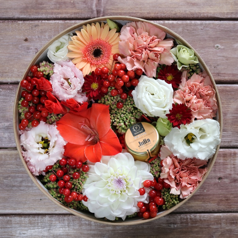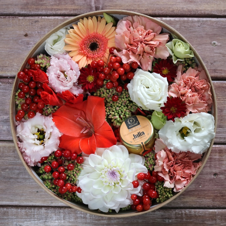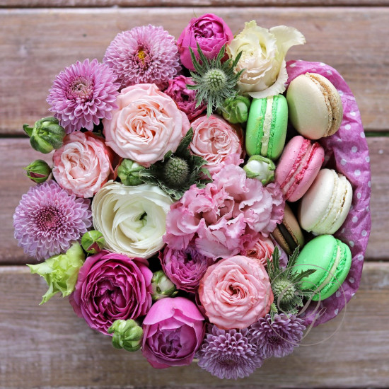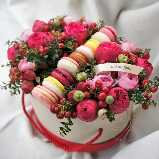 Авторские цветочные композиции в элегантных коробках различных форм, цветов, размеров, с добавлением сладостей в виде: баночки меда peroni, французских пирожных macarons, имбирных пряников и свежих ягод.