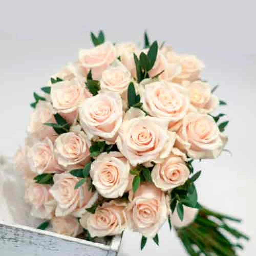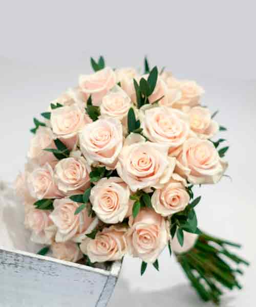 Букет невесты из кремовых роз. Свадебный букет классической круглой формы в розовом цвете. Ножка букета декорирована атласными лентами.
