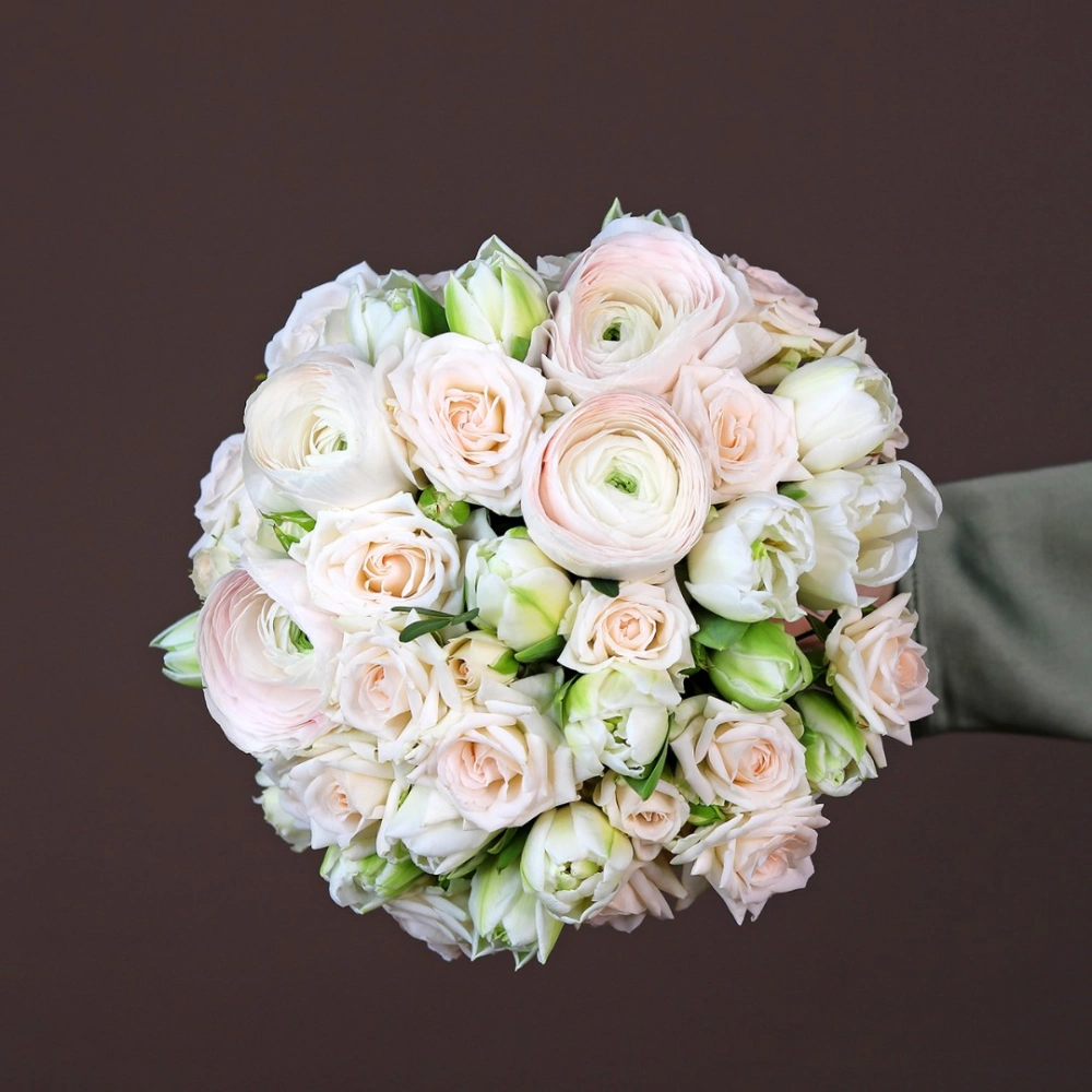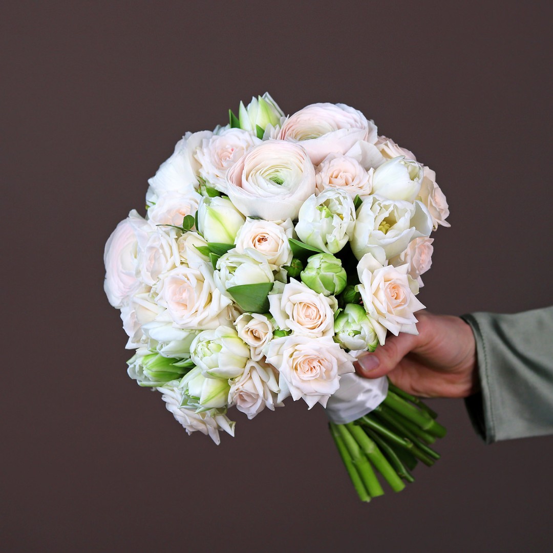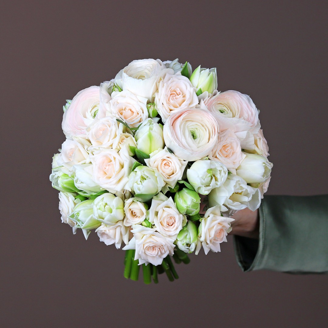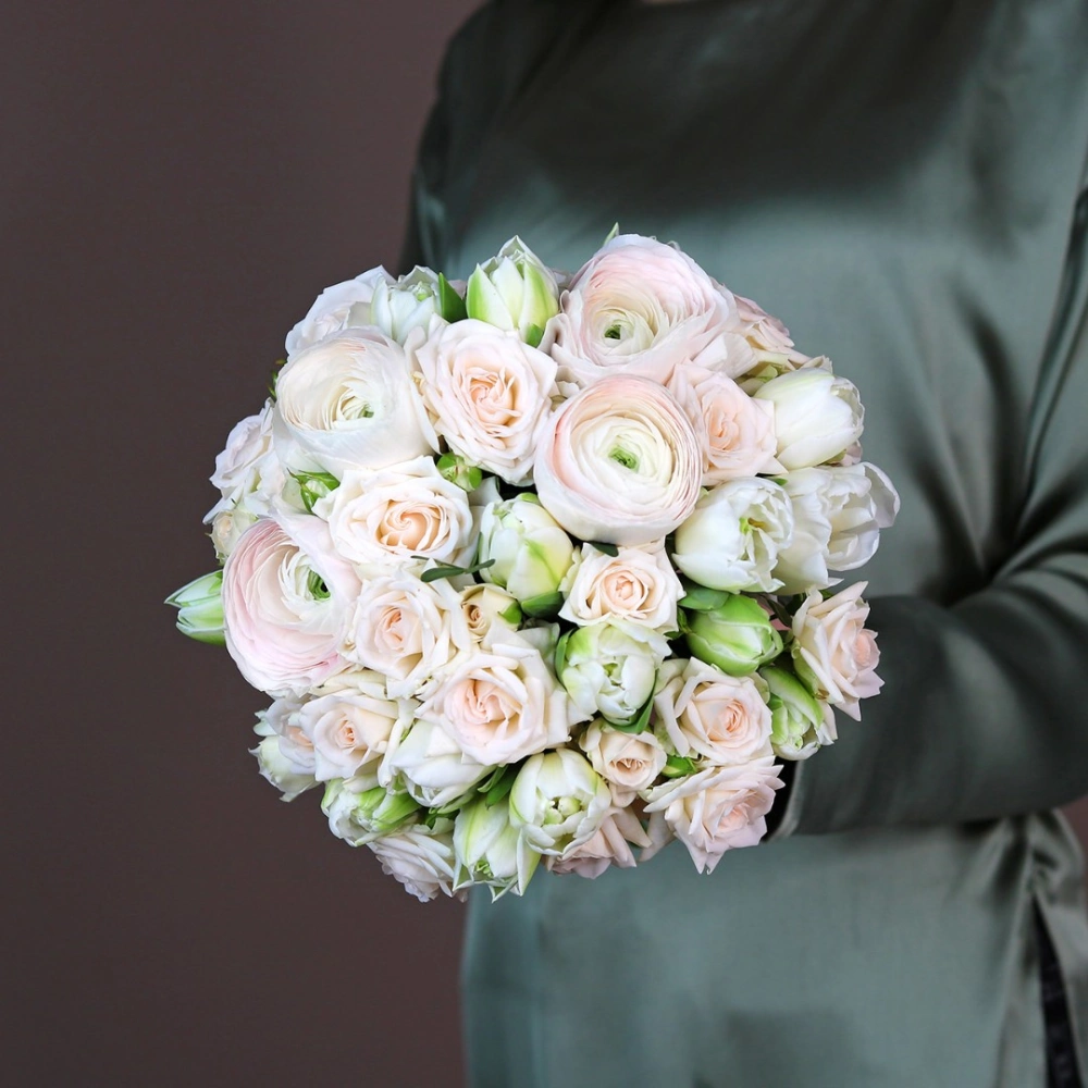 В составе букета: роза кустовая бежеая, ранункулюс и махровые белые тюльпаны.