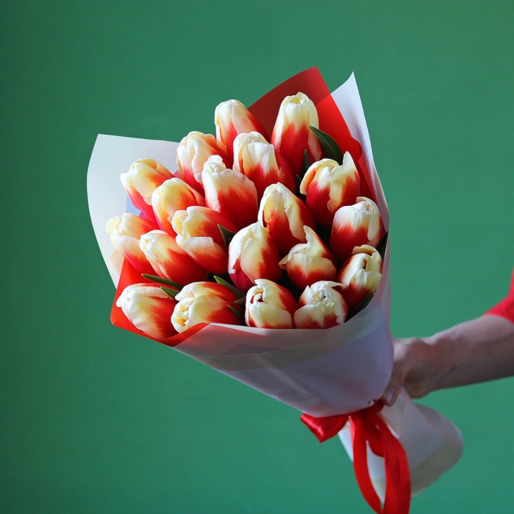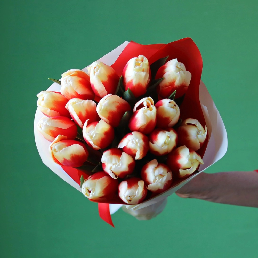 Букет из двухцветных Тюльпанов. Вы можете выбрать любое количество цветов указанное в перечне к данному букету.
