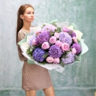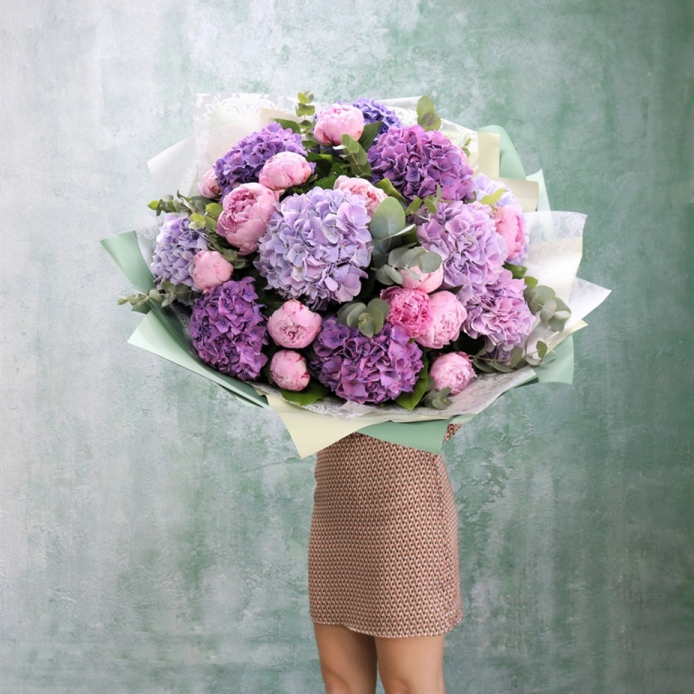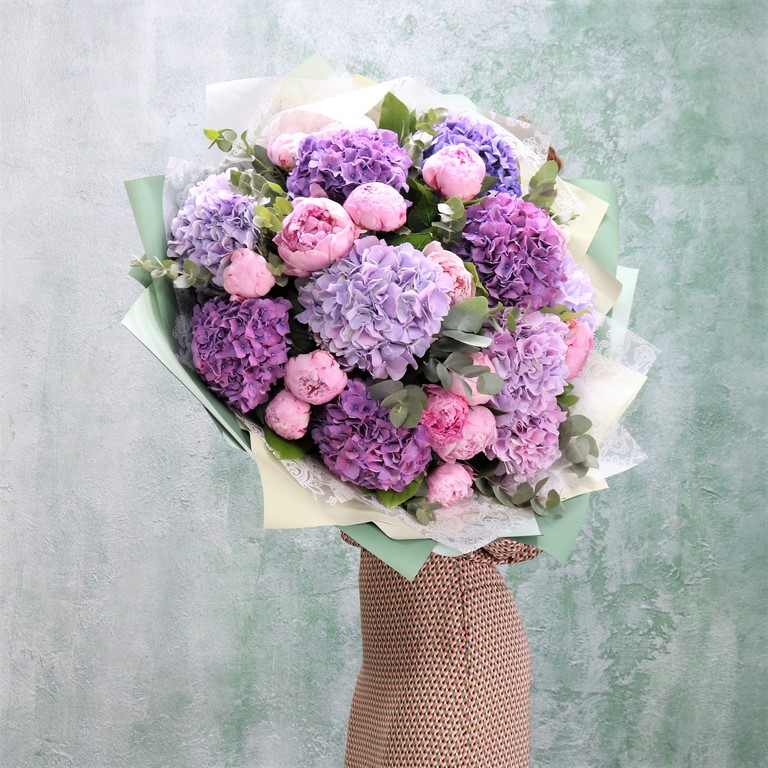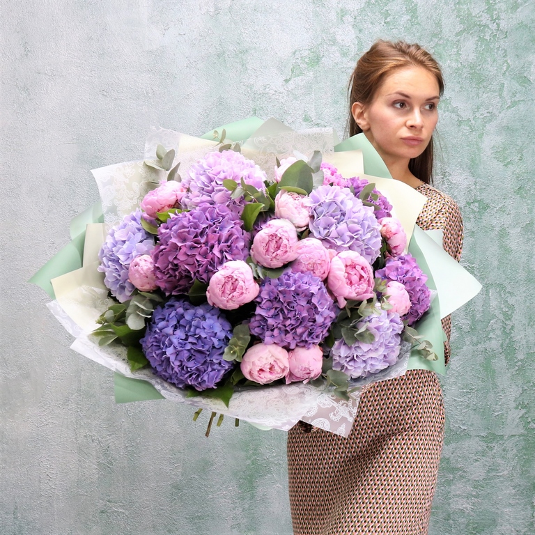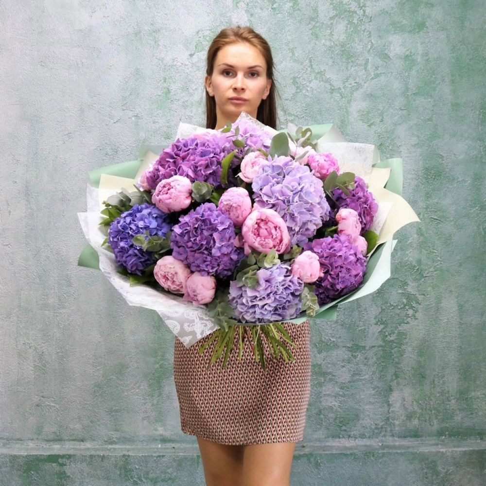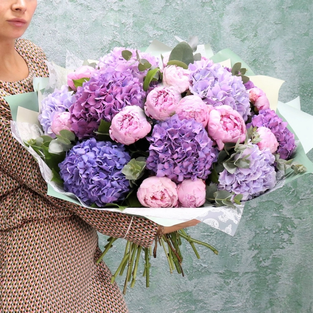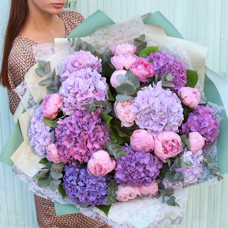 Большой букет из розовых пионов и разноцветных гортензий. Авторский летний букет из крупных пионов и пышных шапок гортензий, букет акуратно упакован, доставляеться с водой в специальной, картонной переноске.