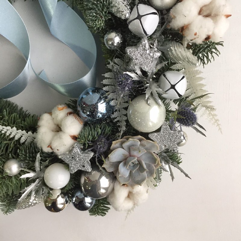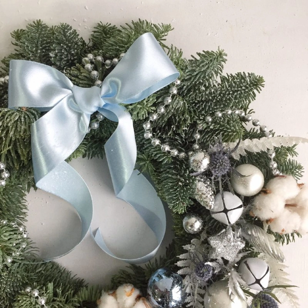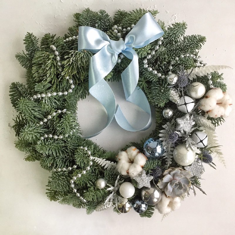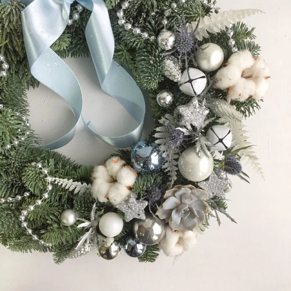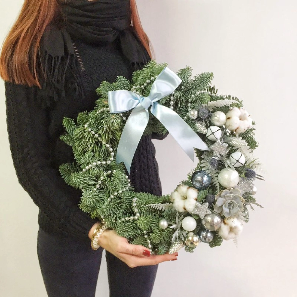 Очаровательный Новогодний венок в голубых тонах из натуральной ароматной ели украшенный разнообразным новогодним декором. Такой венок станет замечательным подарком в преддверии Нового Года и Рождества для ваших родных, друзей, родителей, коллег, знакомых.