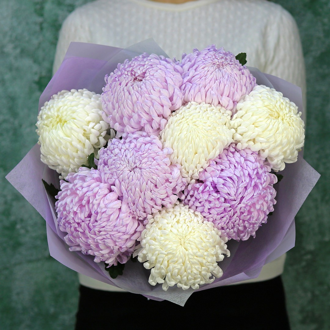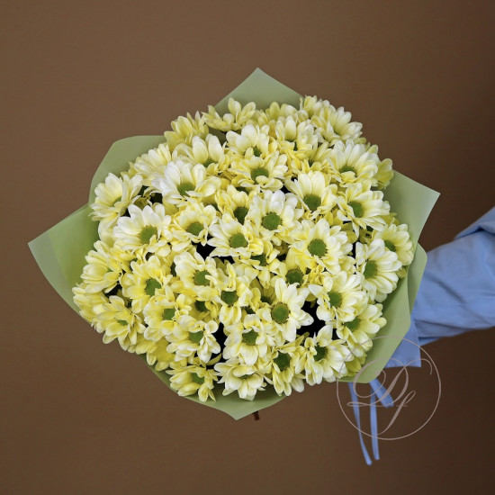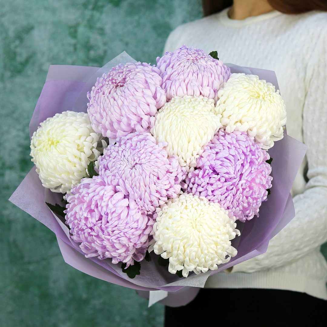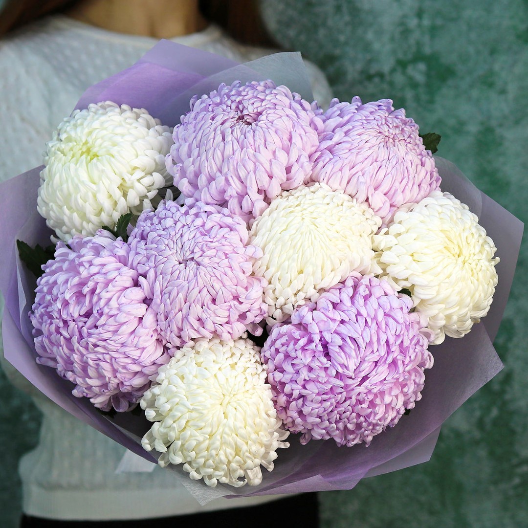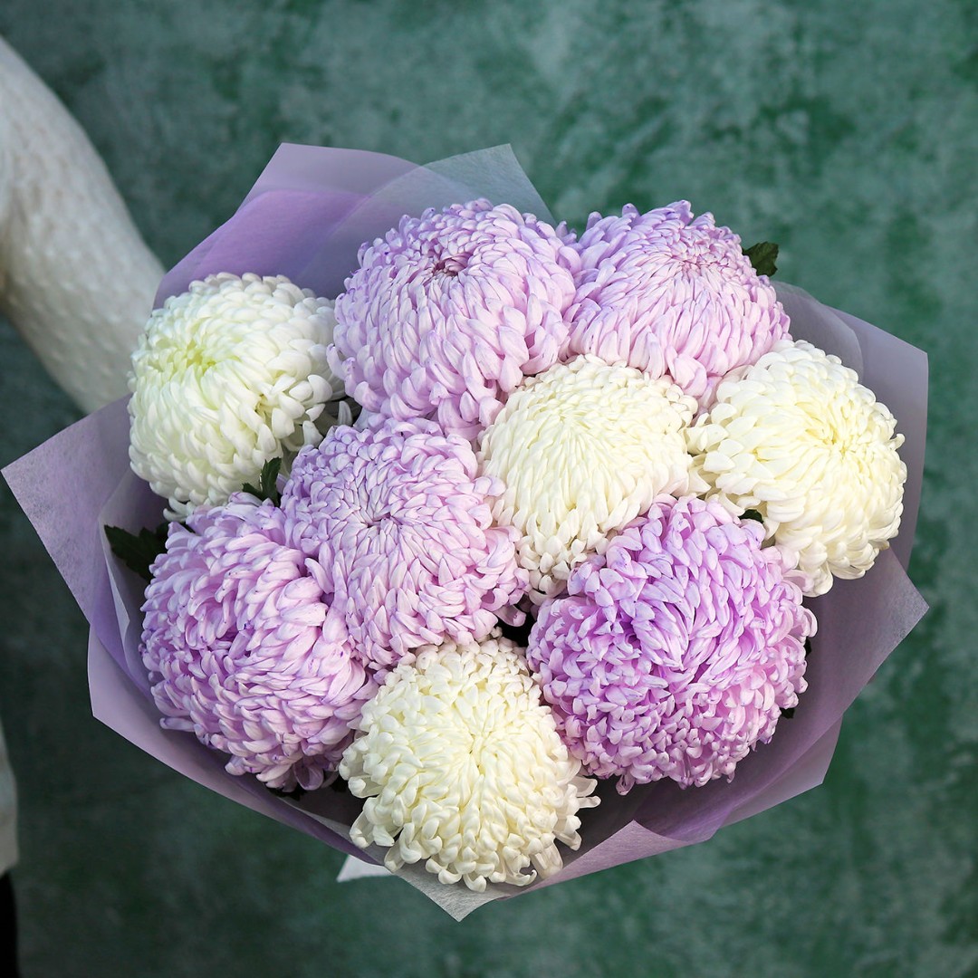 Букет из белых шаровидных Хризантем. На фотографии букет из 15 белых хризантем. Вы можете выбрать любое количество цветов указанное в перечне к данному букету.