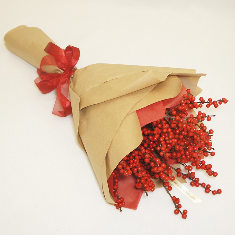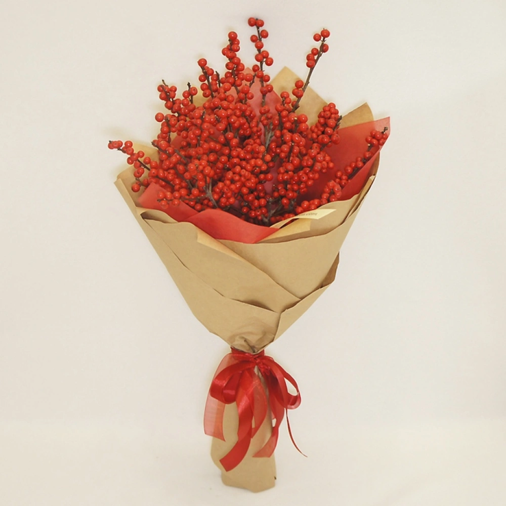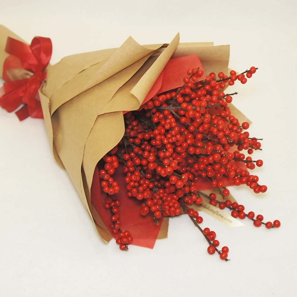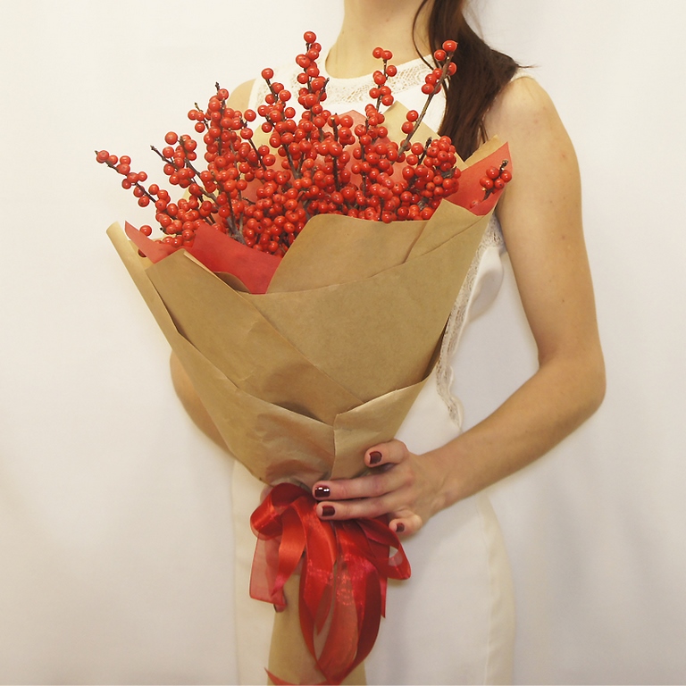 Необычный и очень зимний букет из пятнадцати веточек илекса. Эти налитые красные ягодки обязательно удивят и конечно порадуют своего адресата. Ягодный букет подчеркнет ваше особое отношение, ведь его уж точно не назовут "дежурным"). Отличный подарок в День Рождения, годовщину, юбилей, 8 марта или День Всех Влюбленных. Ягоды очень долго стоят, к тому же они, в отличие от цветов не имеют традиционного символического значения, и Вы можете придать букету любой смысл, в зависимости от повода не боясь попасть впросак. Букет художественно упакован в крафт и перевязан лентой.