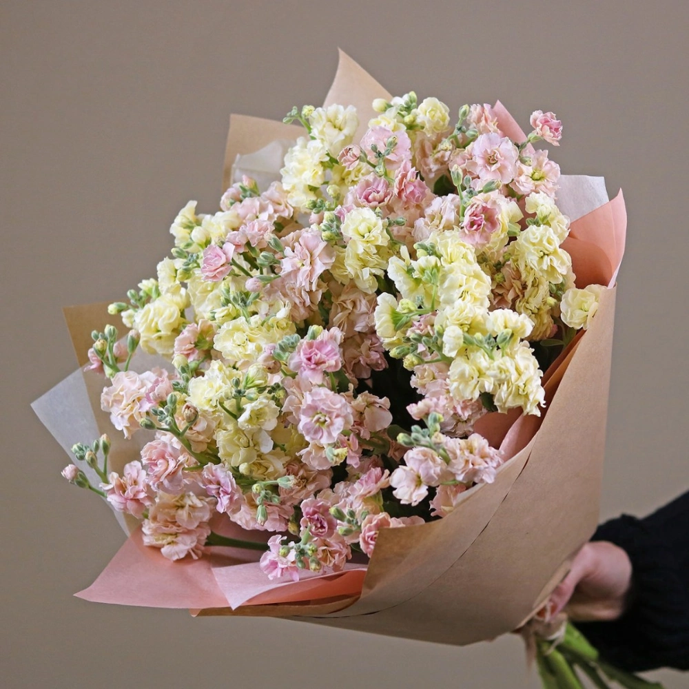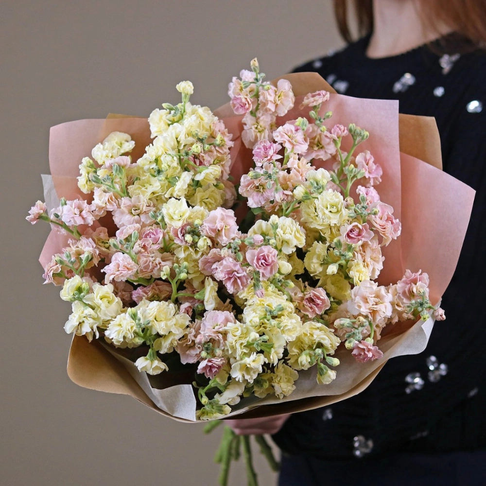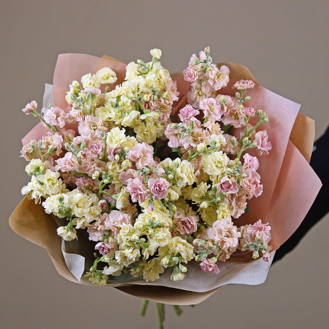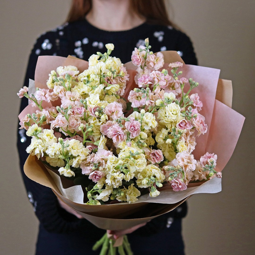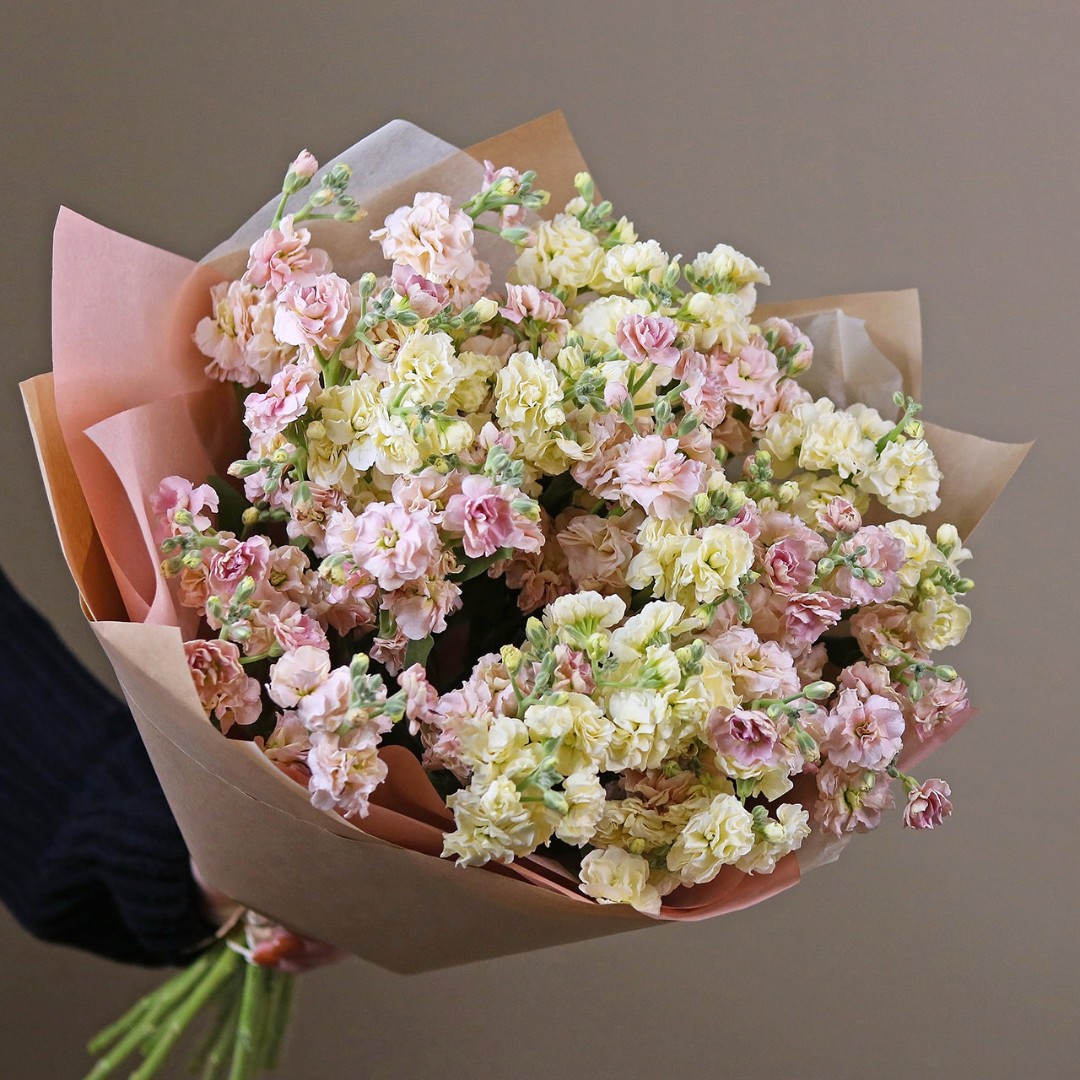 Маттиола букет купить с доставкой в Москве. Душистые цветы маттиолы бывают разного цвета, на одном стебле собрано множество соцветий, цветок невероятно ароматный. Вы можете выбрать любое количество цветов указанное в перечне к данному букету.