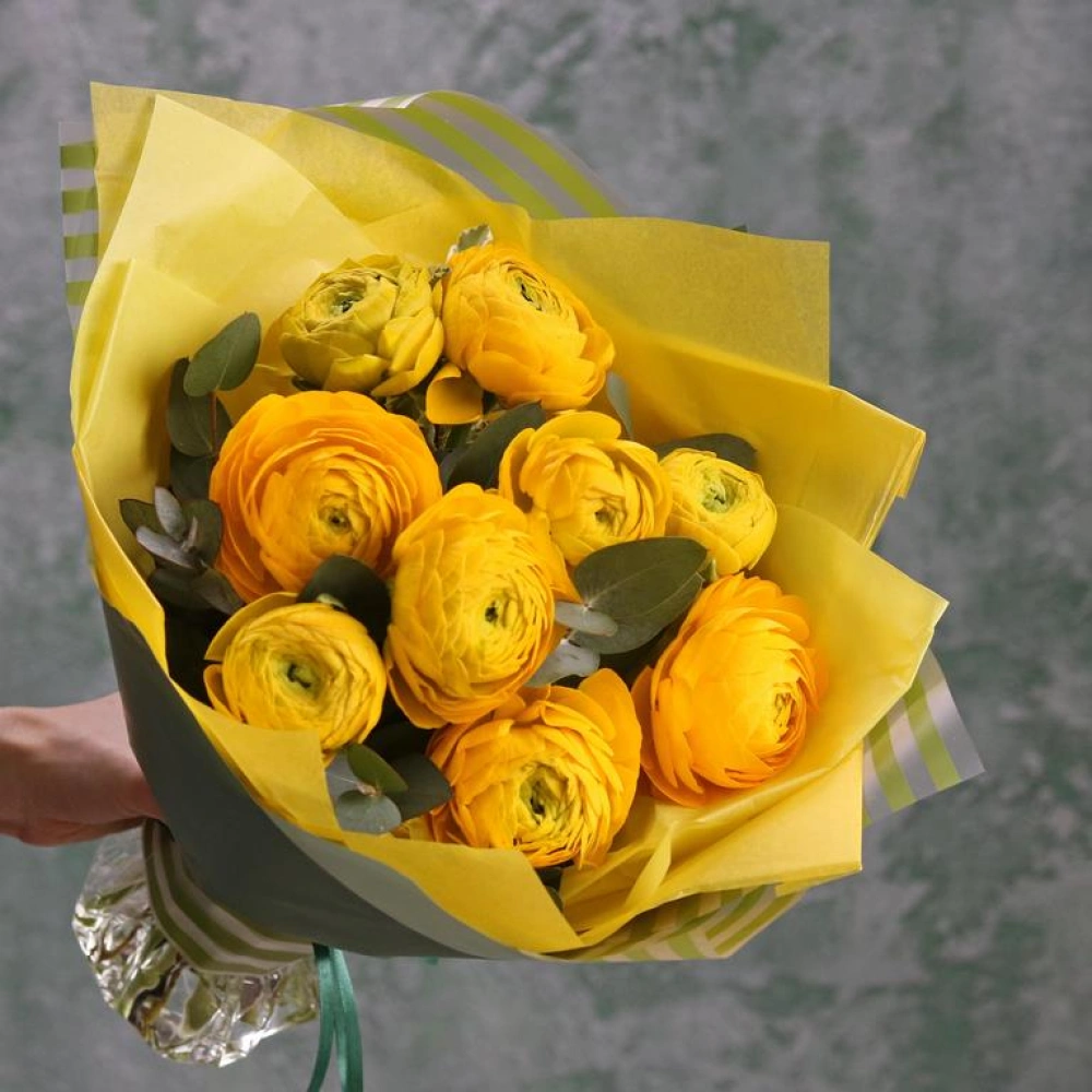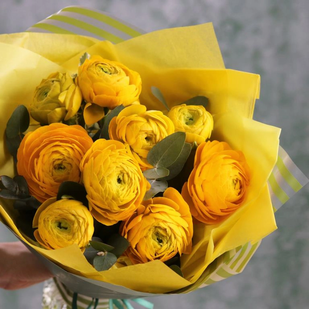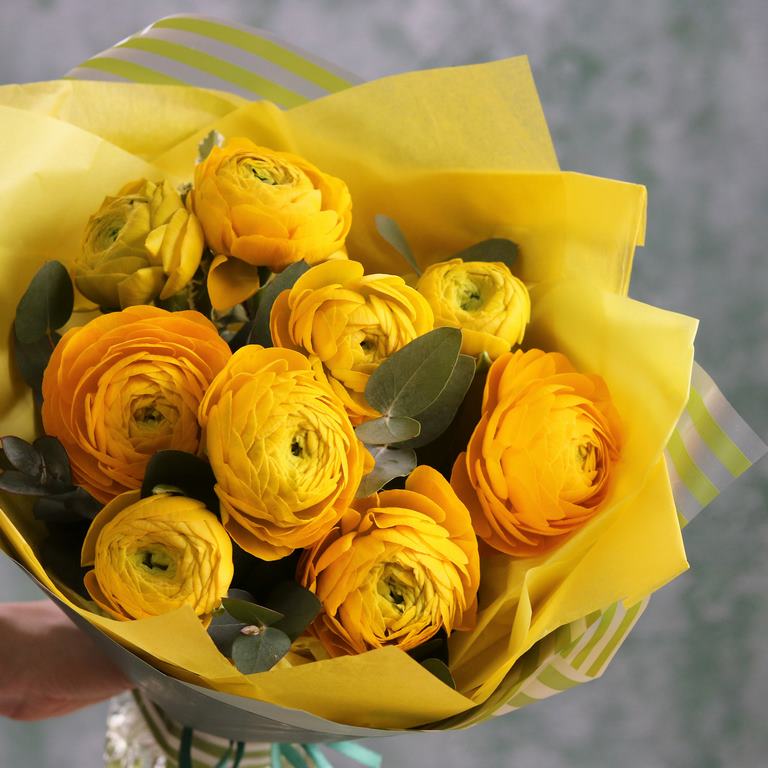 Букет из желтых Ранункулюсов с эвкалиптом. Вы можете выбрать любое количество цветов указанное в перечне к данному букету.